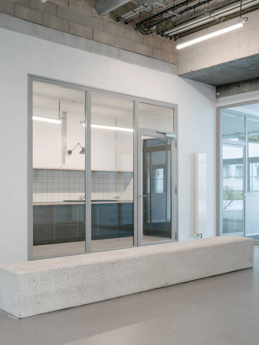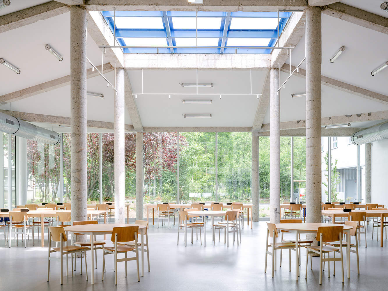 从外部看,整体设计的浅灰色让植被占据了主导地位,营造了各种景观或城市环境。在这个拒绝抹去的背景下,有几个物体因其形状或颜色而脱颖而出。连接半层的金属楼梯已经重新粉刷,恢复了原来的亮蓝色。这些颜色也用于标牌和房间的室内家具,围绕这种颜色及其互补色调进行设计。其他纯几何形状用于公共区域,例如通风管道中的铬圆柱体和细长的白色混凝土铺路石长凳。