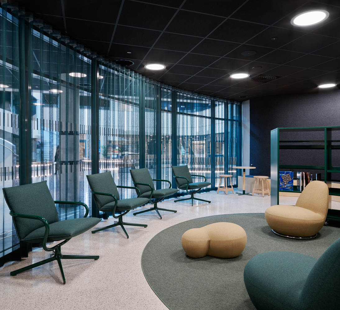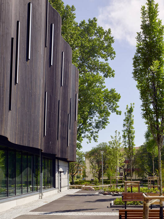 The activities on the ground floor thus help illuminate the space to promote safe outdoor environments around the building. The interior design is characterized by natural materials such as slate and wood, combined with a subdued color scheme in dark hues, to contribute to a calm and harmonious environment where students can feel at home. The sports hall consists of an event hall with retractable bleachers for 1,000 spectators and a ceiling height of 10 meters. The hall can be divided into two full-sized halls with a curtain wall, allowing the spaces to be used in the best possible way by both the school and the community organizations.