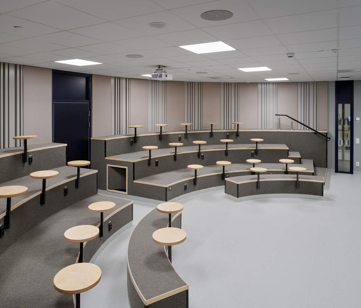 因此,一楼的活动有助于照亮空间,促进建筑周围的安全户外环境。室内设计以板岩和木材等天然材料为特征,结合深色色调的柔和配色方案,营造出一个平静和谐的环境,让学生有宾至如归的感觉。体育馆包括一个活动大厅,可容纳1000名观众,天花板高度为10米。大厅可以分为两个带幕墙的全尺寸大厅,使学校和社区组织能够以最佳方式使用这些空间。