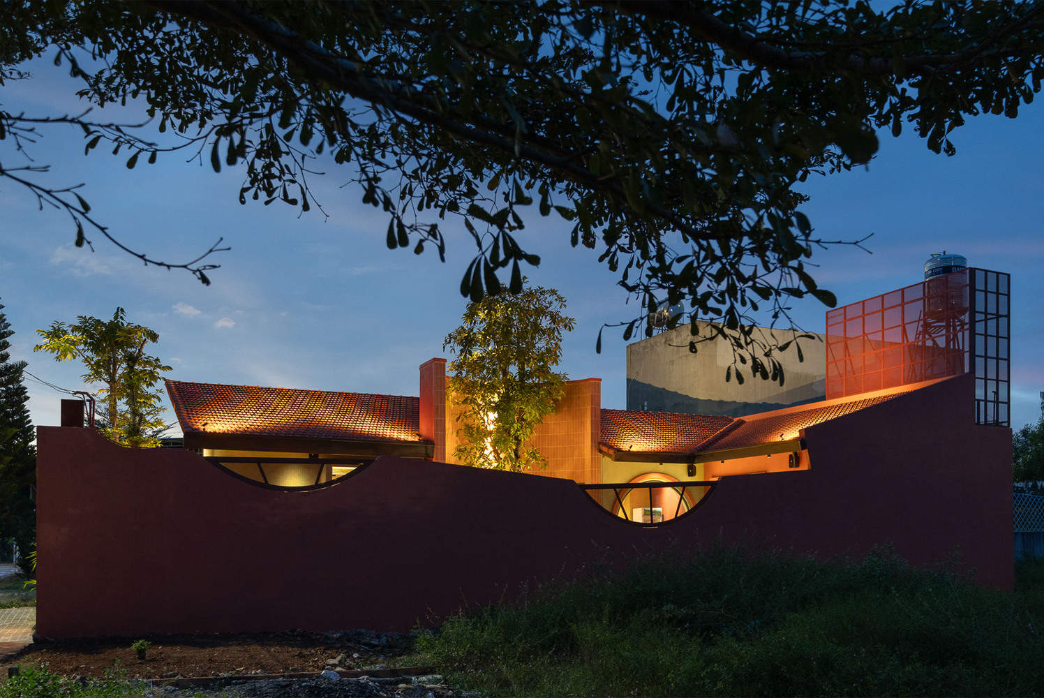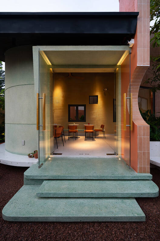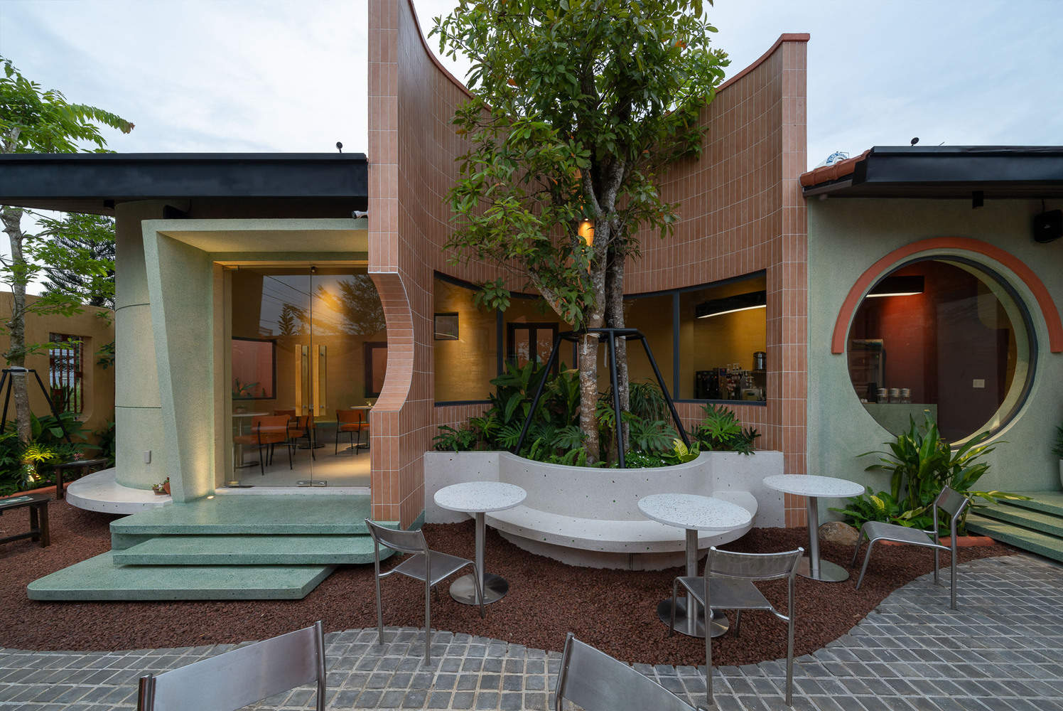 The entire structure of our project creates a wide, protruding tile roof, interwoven, and linked into circular blocks that surround the trees, creating a large space, the space is arranged into two different areas, one side is the homeowner's private area, the other side is a section for diners to sit and enjoy sweet cakes. With the spirit of creating a gentle, quiet space, we use rustic materials with a sensitive surface.