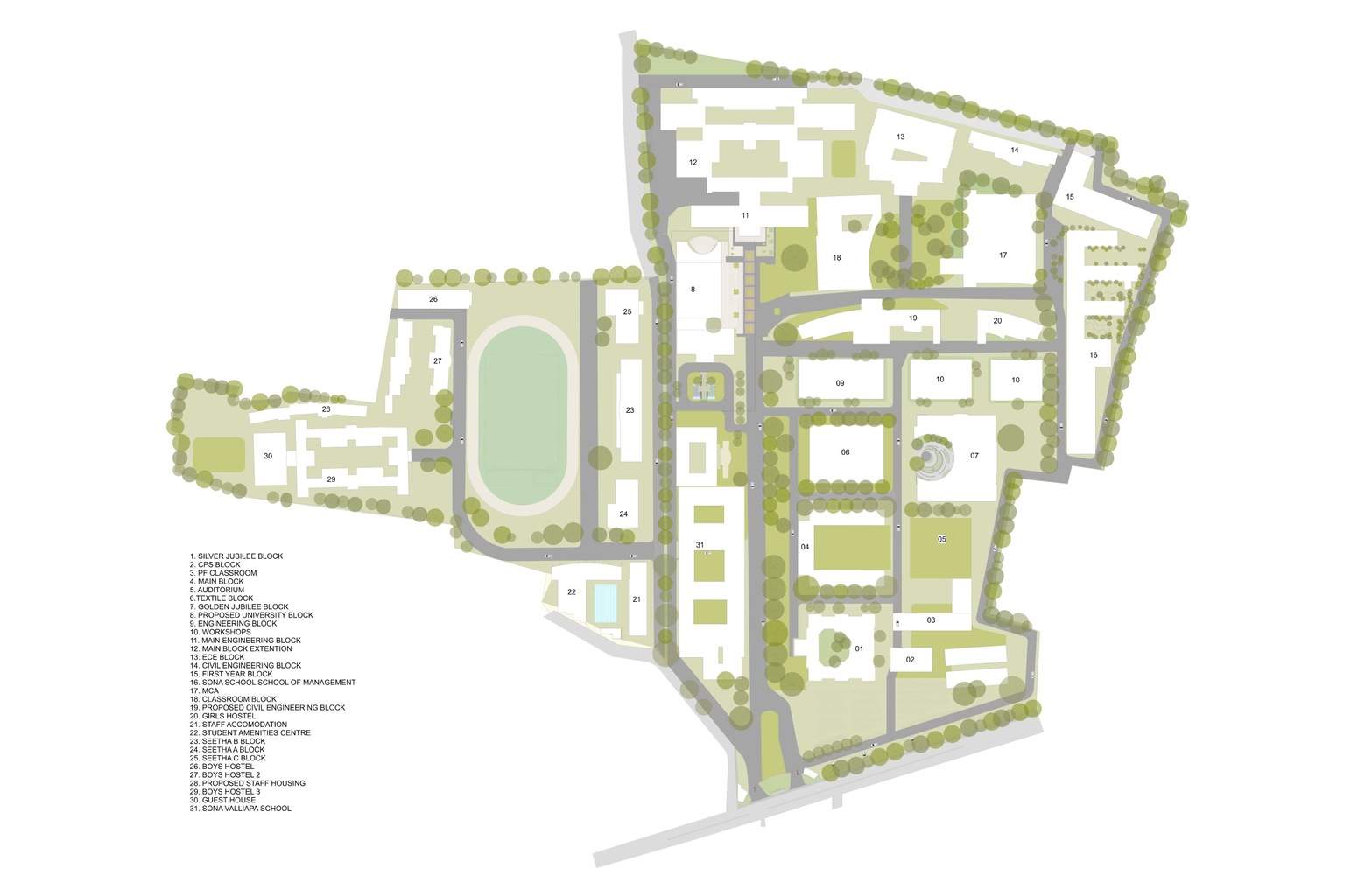 The core design principles of all the buildings on the Sona College of Technology campus are the same - driven by functionality and primary principles of sustainability that ensure better lighting, ventilation, movement and indoor-outdoor connections. However, each building still carries a distinct identity and characteristics that have evolved along with the evolving needs of the institute. While they all belong together, they remain true to the times they were built. The Sona The Sona College's Admin and Library block complement the Main Administration building, the Heritage Block, blending modern architectural elements to integrate seamlessly with the campus. The campus and each building, including the recent additions, balance their aesthetic appeal with functional efficiency, embodying the institution's modern educational ethos and community integration.