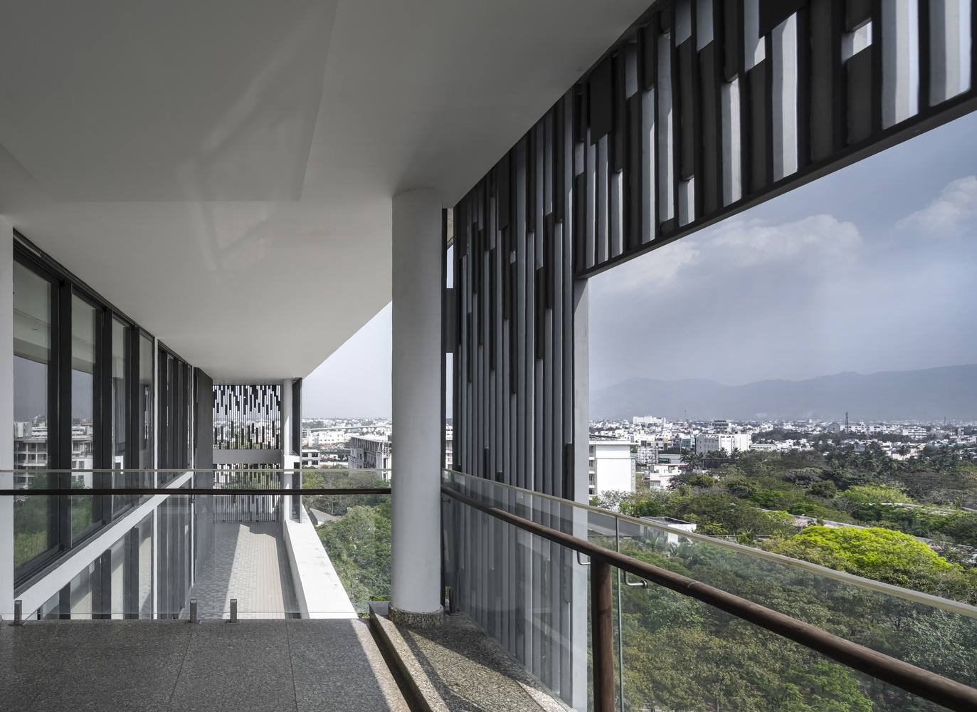 这两座建筑都由4个突出的水平带定义,这些水平带具有不同的体量和材料,营造出多座建筑的错觉。比例和材质的游戏创建了一个层次结构,通过在每个级别使用不同的材质(如MS Jali、砌体框、DGU滑动和DGU结构玻璃)来区分。这展示了“迈向未来的垫脚石”的概念,强调了一种前瞻性的设计理念,该理念整合了多种材料,象征着建筑原则的进步和演变。