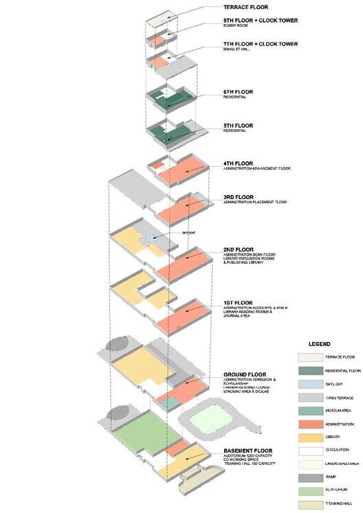 Text description provided by the architects. Established in 1993, the Sona College of Technology campus has grown into a hub of educational excellence in Salem, the "Steel City" of Tamil Nadu, fostering a dynamic learning environment for growth and innovation amidst the city's industrial backdrop. Initially catering to a thousand students, the institute's rapid growth has called for continuous expansion, and the adaptable masterplan has continuously evolved to accommodate a flourishing student body that now numbers over 8,000. This growth mirrors the aspirations of the people of Salem and surrounding areas for upward mobility and diverse educational opportunities. IMK has been associated with the project since its inception, and the recent additions to this continuously growing hub are the Sona College's Admin and Library Block. These have been collectively designed as modern landmarks symbolizing the college's commitment to progress. Designed as "Stepping Blocks to the Future", the two buildings stand as a beacon of architectural innovation in Salem. The distinct facade of the Library Block is the new face of the Sona College of Technology. It has been conceptualized as a symbol of progression, and the building features a stepped facade with striking designs and materials, culminating in a clock tower offering panoramic views of the city.