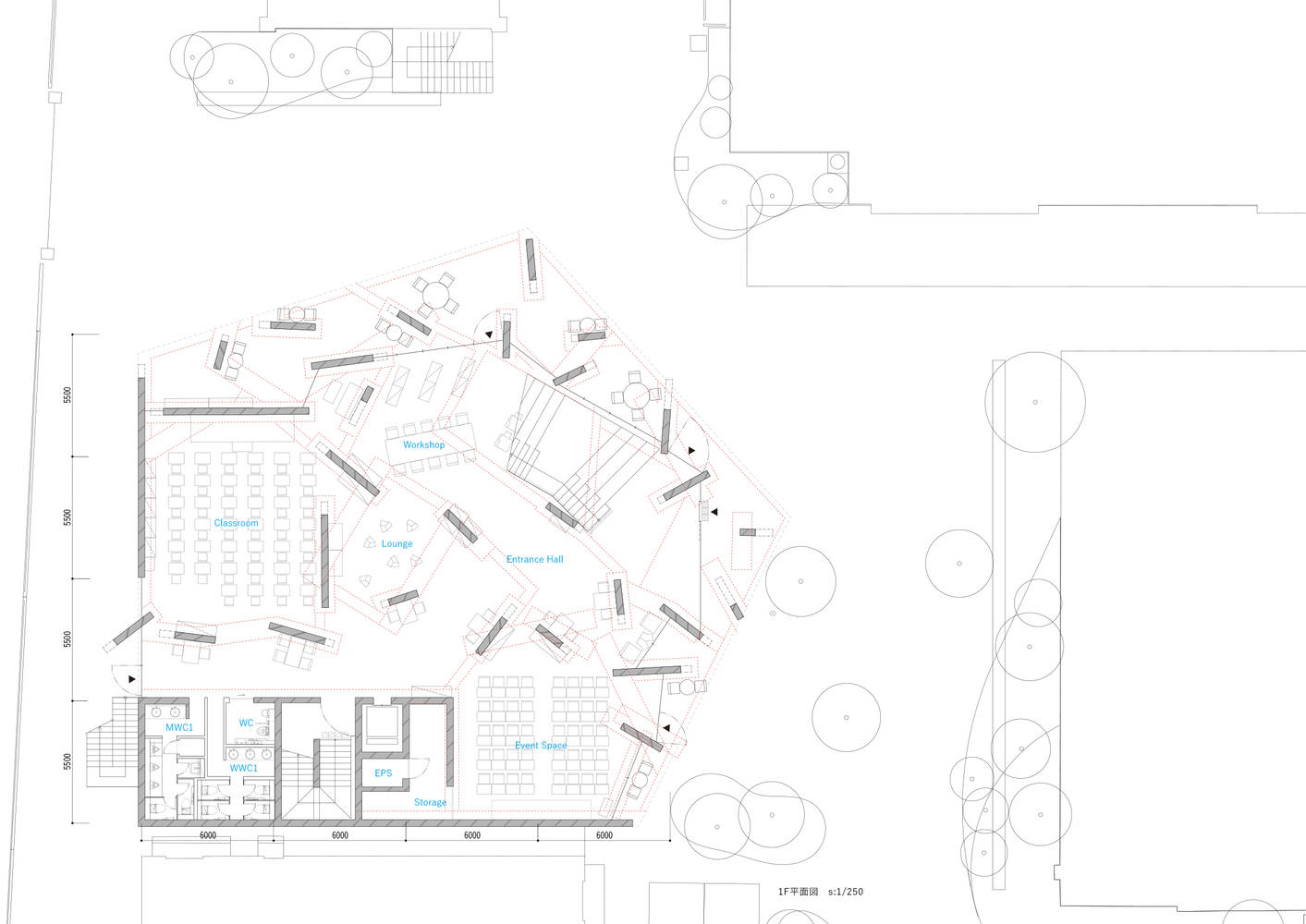Freed from the uniform directional layout of traditional classroom planning, the walls became more random. In this generous environment, where walls gently enclose the classrooms, users are free to form their own spaces, creating a nest-like layout.