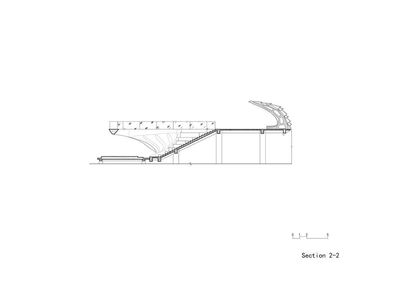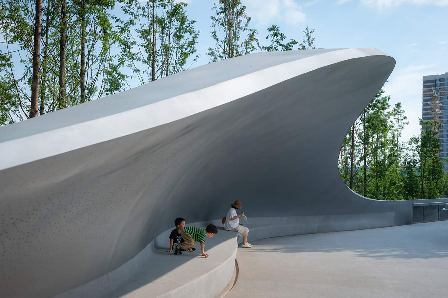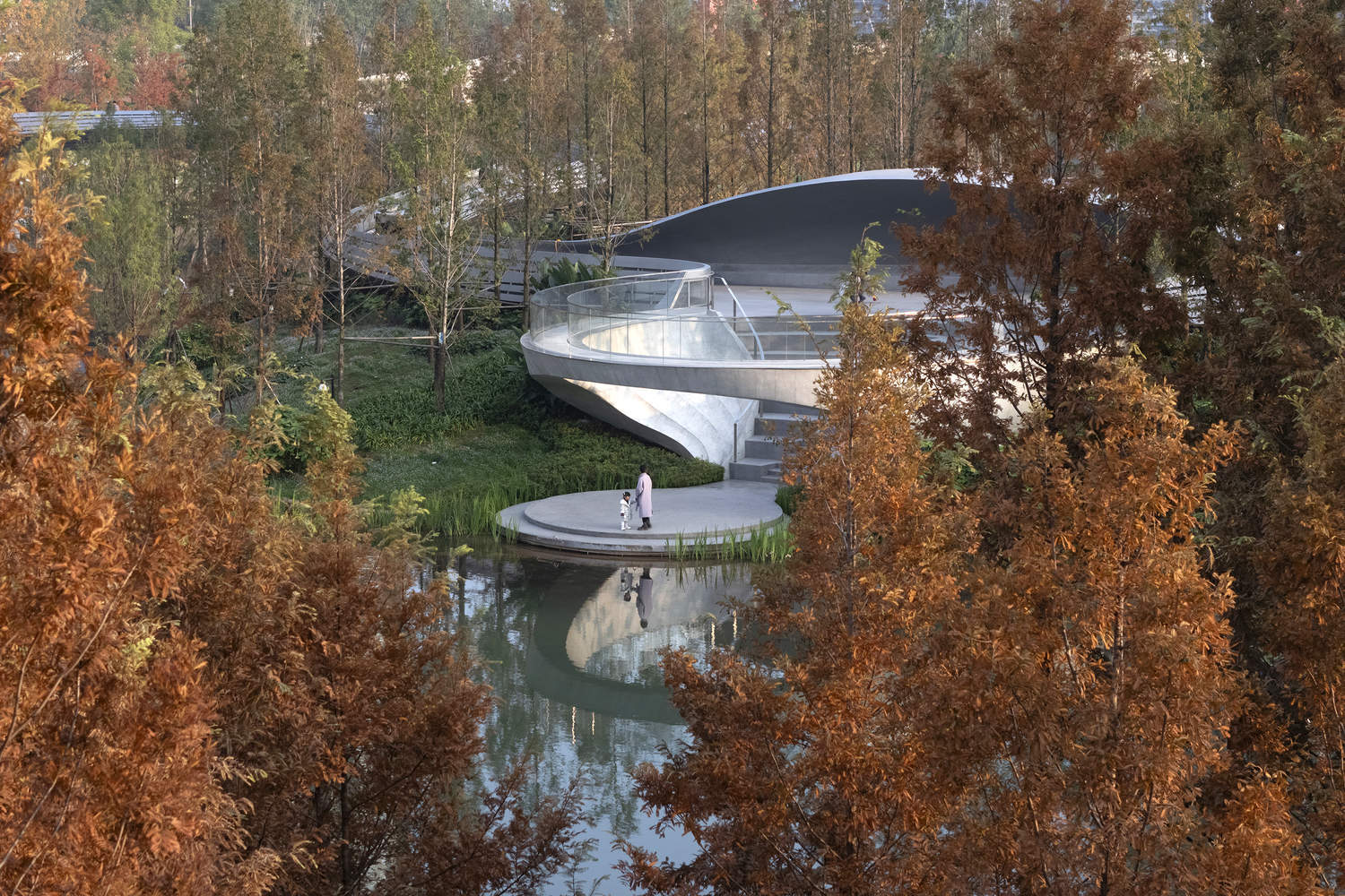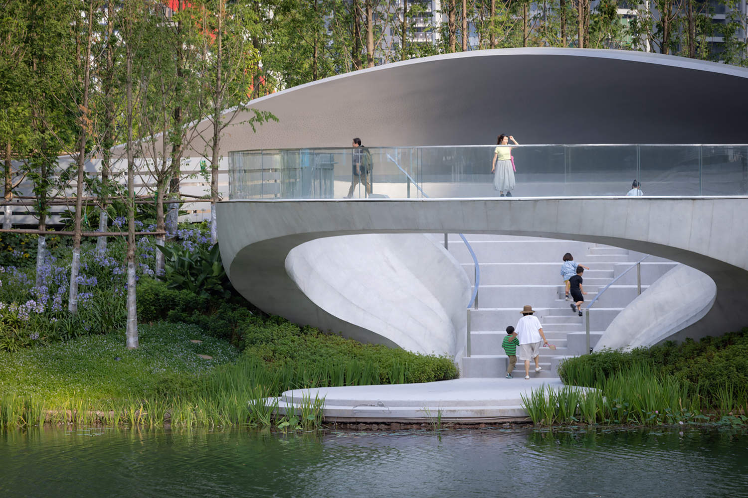 In the initial concept design, a water curtain was planned for the cantilevered structure. When people first step into the park, they hear the gentle sound of water flowing in the distance. The mist created by the water splash formed a barrier, like a thin veil, making it difficult to see clearly. Unfortunately, the water curtain could not be retained during the implementation of the project. As visitors proceed along the winding paths, the building, hidden in the natural landscape, can only be partially glimpsed, presenting different appearances as the angle of view changes. Upon reaching the building, visitors enter a new world wrapped in white concrete. The railing of the pedestrian bridge across the water has been intentionally enlarged here, naturally forming a pavilion that provides shelter from wind and rain.