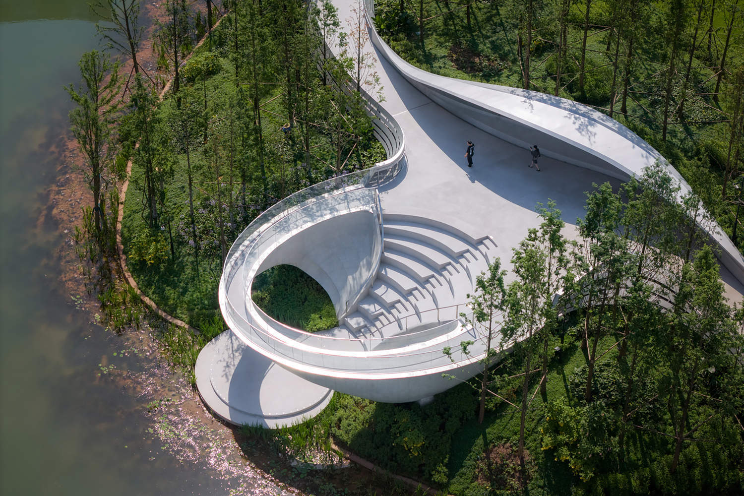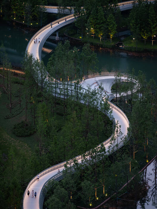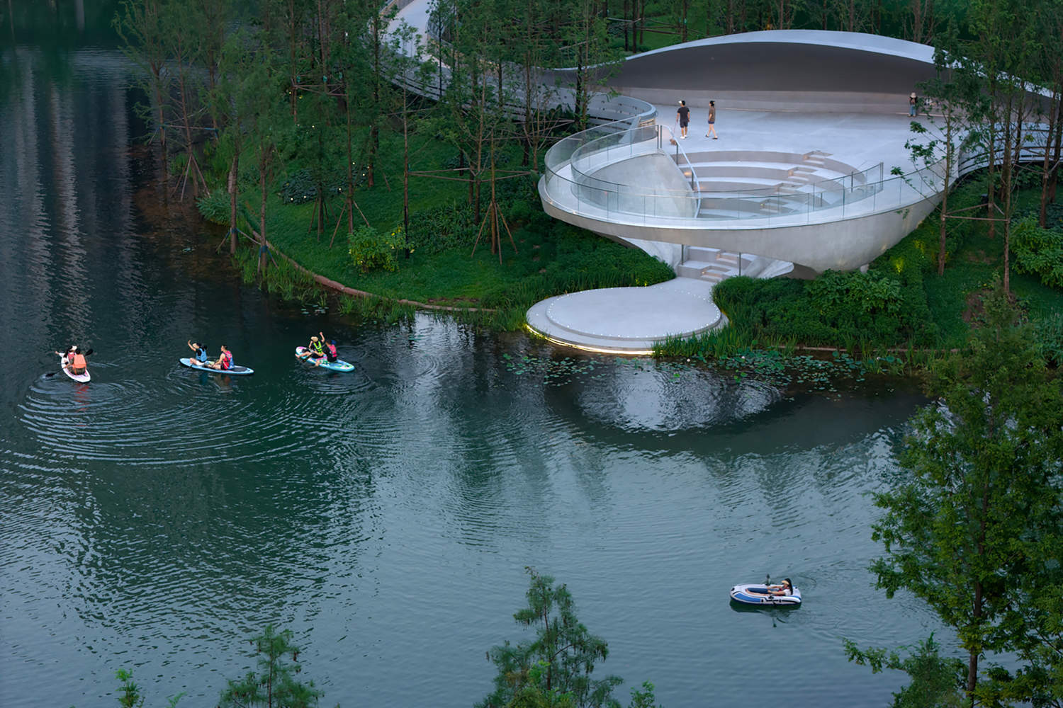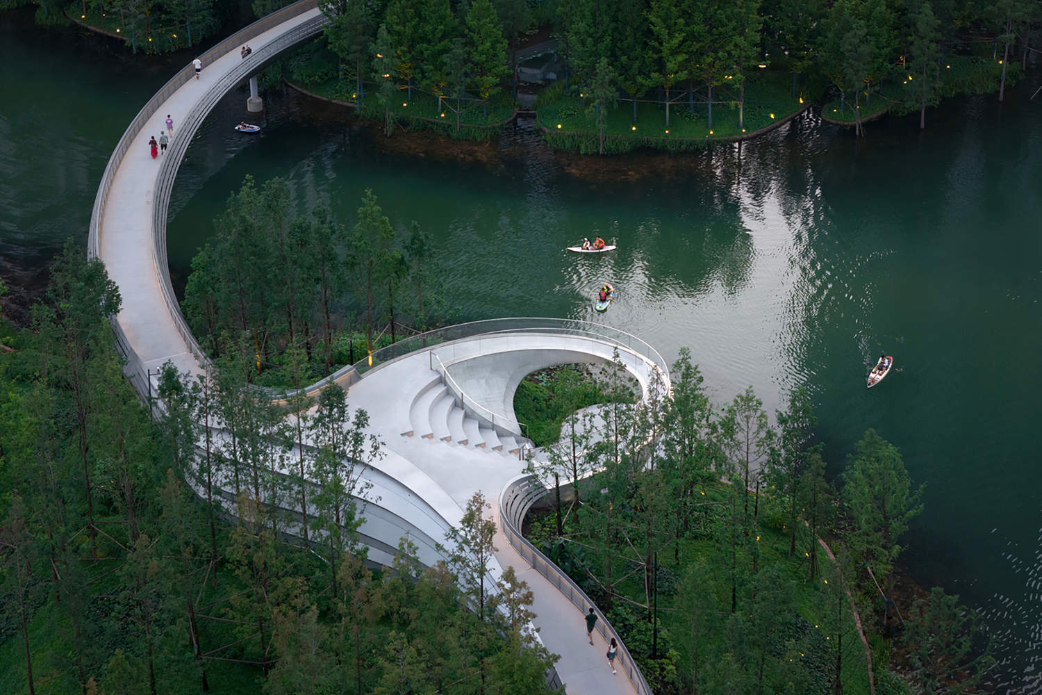 At the centre of the site, the bridge meanders downward to the water surface, naturally forming an open-air theatre. The stage at the end is level with the water level, resembling a lotus leaf. Visitors coming from the water can also board the platform by boat and ascend the stairs, following the cantilevered bridge along the water's edge, enjoying the view from the railing, or becoming part of someone else's scenic view. As night falls, everything quiets down. The busy residents return home, and looking down from the windows of the high-rise buildings, the Ring of Starlight appears like a crescent moon on the water's surface, adding a poetic touch to the tranquillity of the night.