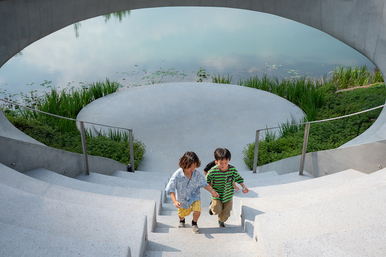 Our design intentionally enhanced the sensory connection between visitors and the natural environment. The view of the water theatre faces the water's surface, drawing visitors' attention to the ripples caused by the breeze, the changing reflections in the water, and the delicate rhythm of light and shadow on the clear concrete walls. This hidden space will become a brief refuge from reality, where people can find inner peace and harmony during their time of self-reflection.