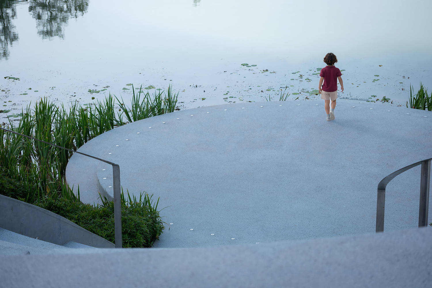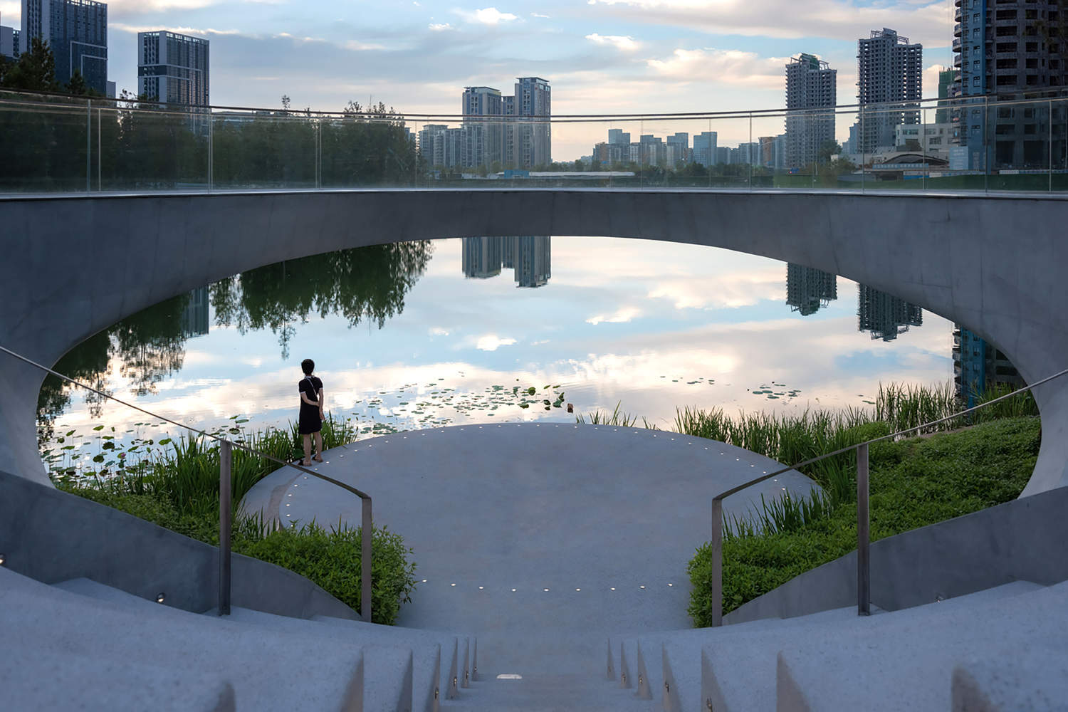 在场地的中心,这座桥蜿蜒向下延伸到水面,自然形成了一个露天剧场。末端的舞台与水位齐平,宛如荷叶。从水中来的游客也可以乘船登上平台,沿着水边的悬挑桥登上楼梯,从栏杆上欣赏风景,或者成为别人风景的一部分。夜幕降临,一切都静了下来。忙碌的居民回家后,从高层建筑的窗户往下看,星光环就像水面上的新月,为夜晚的宁静增添了诗意。