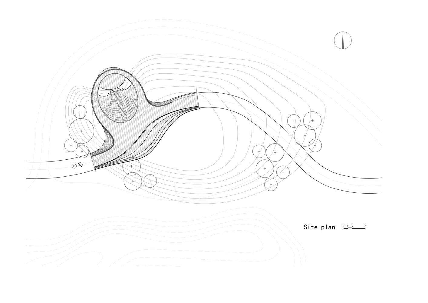 在这个与自然紧密相连的环境中,开发商希望这座直径只有25米的小建筑能成为公园的中心地标。在现场呆了几天后,一个灵感逐渐出现:我们不想让它的存在通过一个巨大的群体来体现,而是希望它与自然和谐相处,赋予它类似于其他自然元素的活力,随着时间的推移和不断变化的场景展现不同的方面。因此,我们将视野扩展到整个公园,并从中国传统园林的概念中汲取灵感,精心规划了两条通往小建筑的道路——一条陆路和一条水路。游客在旅途中可以体验到“每一步都在改变风景”的感觉