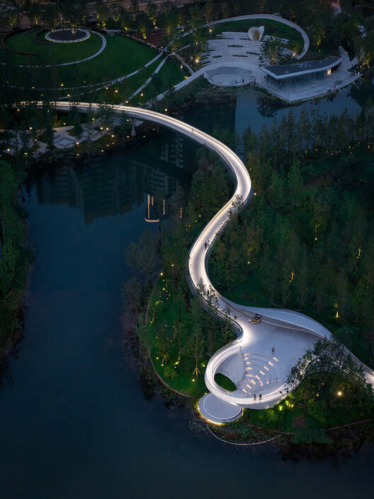 Text description provided by the architects. The Stage at the Centre of the "Vortex" - The Luhu Ring of Starlight project is located on the island at the centre of Vortex Park, which Z+T Studio designed. The entire park is surrounded by a commercial plot and three residential plots, presenting a unique semi-enclosed layout. Although the location of the Ring of Starlight is at the geographic and visual centre of the park, its connection to the outside world is somewhat isolated due to being surrounded by water. Visitors must traverse forest paths or take a small boat, trekking nearly a thousand meters to reach the island from any direction. As a result, this small island has become the most tranquil corner of the entire park, far from the noise and fast pace of the city, resembling an idyllic paradise.