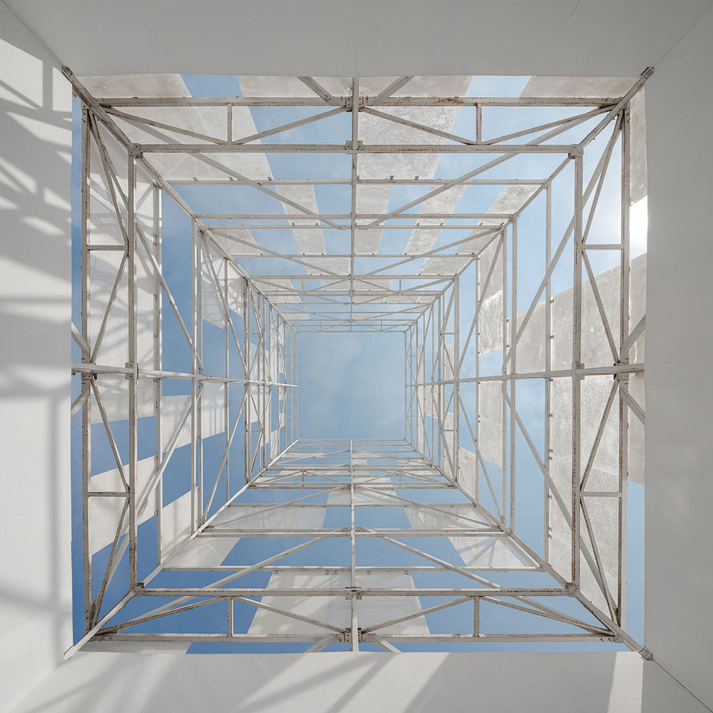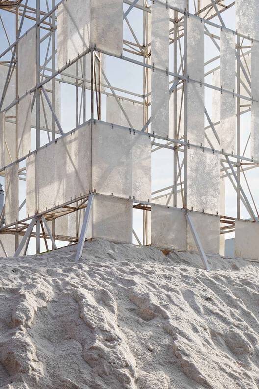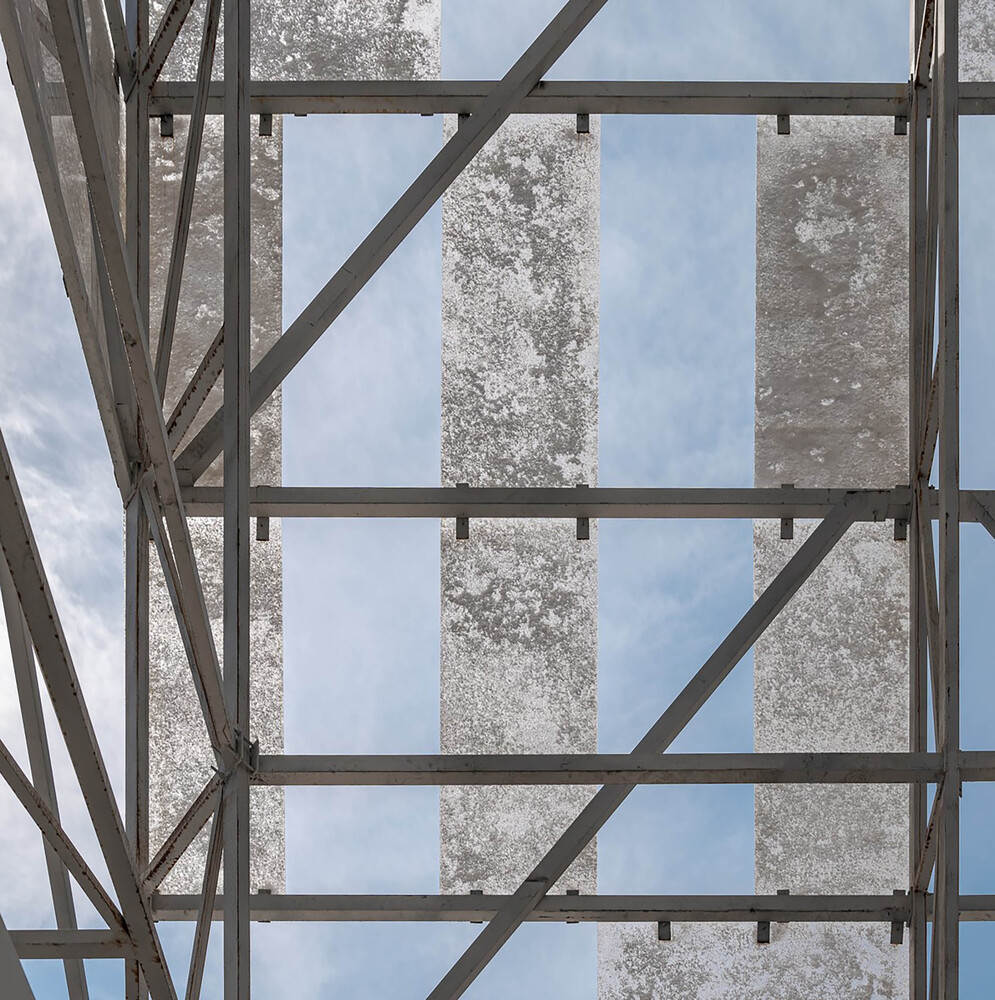 We use three materials: salt, wood, and steel. The accumulated salt forms the base. The wood serves as an interior delimiter and exterior continuity. The emerging element references the ancient metal structures used in the salt trade.