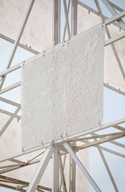 We have explored the natural crystallization process by developing salt panels that cover the tower. We use a base element, 100% recycled cast acrylic. Its surface is covered to enhance adhesion with a layer of bio-resin, applied manually, on which the salt, grown in the crystallizer of the salt pan, is poured, resulting in the most translucent crystal.