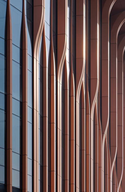 建筑形态与材料运用:项目的精髓体现在其独特的建筑形态和材料运用上。复合屋顶系统创造了隔热、轻质、大跨度的结构,实现了无柱空间,适应展览和使用性质的变化。流畅的建筑语言和褶皱的深铜色立面,结合大型嵌入式窗户,成功平衡了建筑的巨大体量和工业尺度。这种设计语言延续了扎哈·哈迪德一贯的风格,又结合了对当地环境和文化特性的考量,体现了建筑师在形式美学与功能需求之间的完美平衡。铜色立面赋予了建筑独特的视觉冲击力,使其在城市环境中脱颖而出。