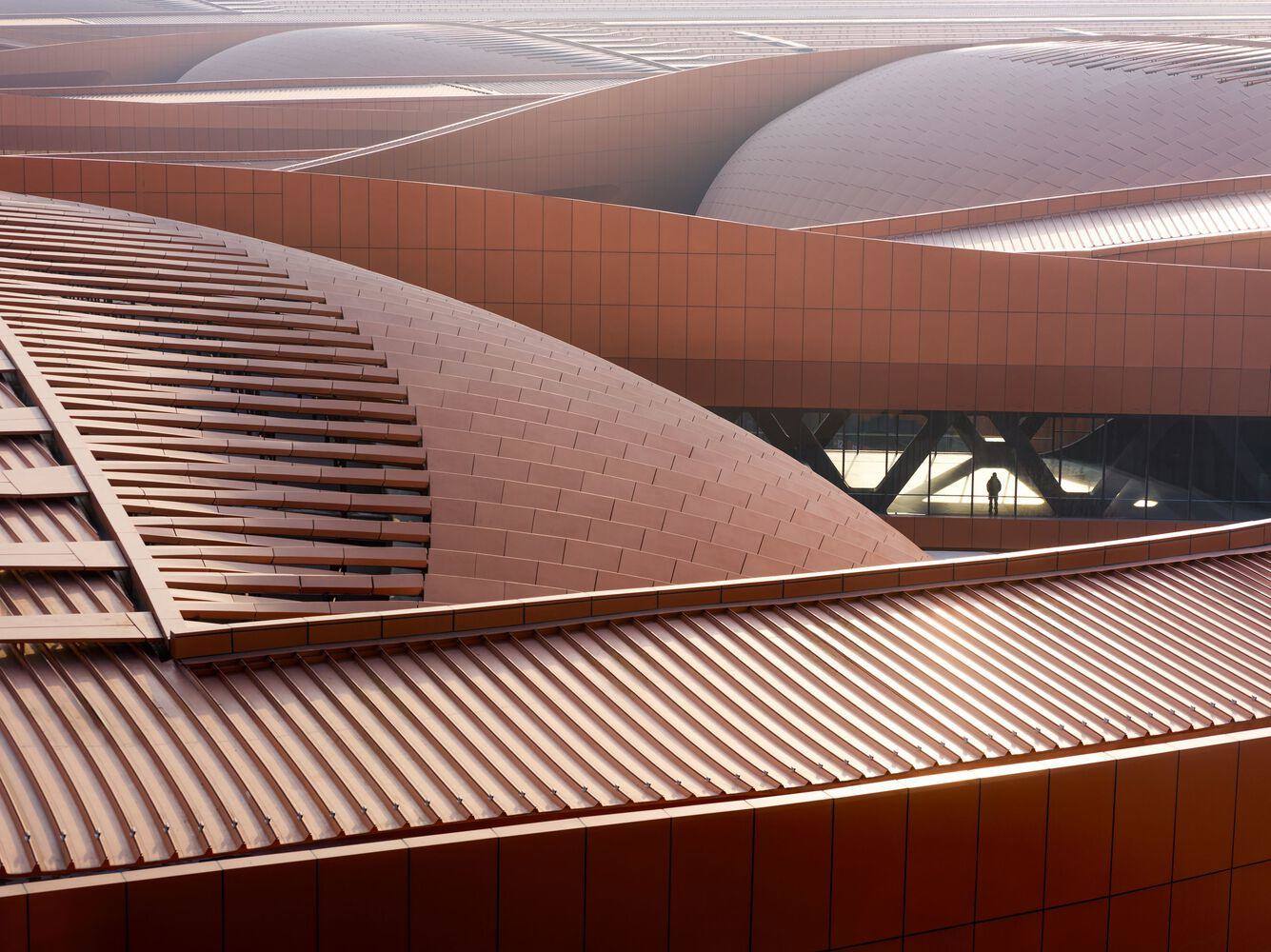 The CIECC's composite roof system of symmetric geometries creates an insulated, lightweight, large-span structure providing column-free spaces that can be quickly adapted to changes in exhibitions and nature of use. This modular fabrication and construction minimized the center's development time, investment, and operational costs. The center's fluid architectural language and pleated, deep copper-colored façade incorporating large, recessed windows, have been designed to balance the CIECC's immense industrial scale and materiality.