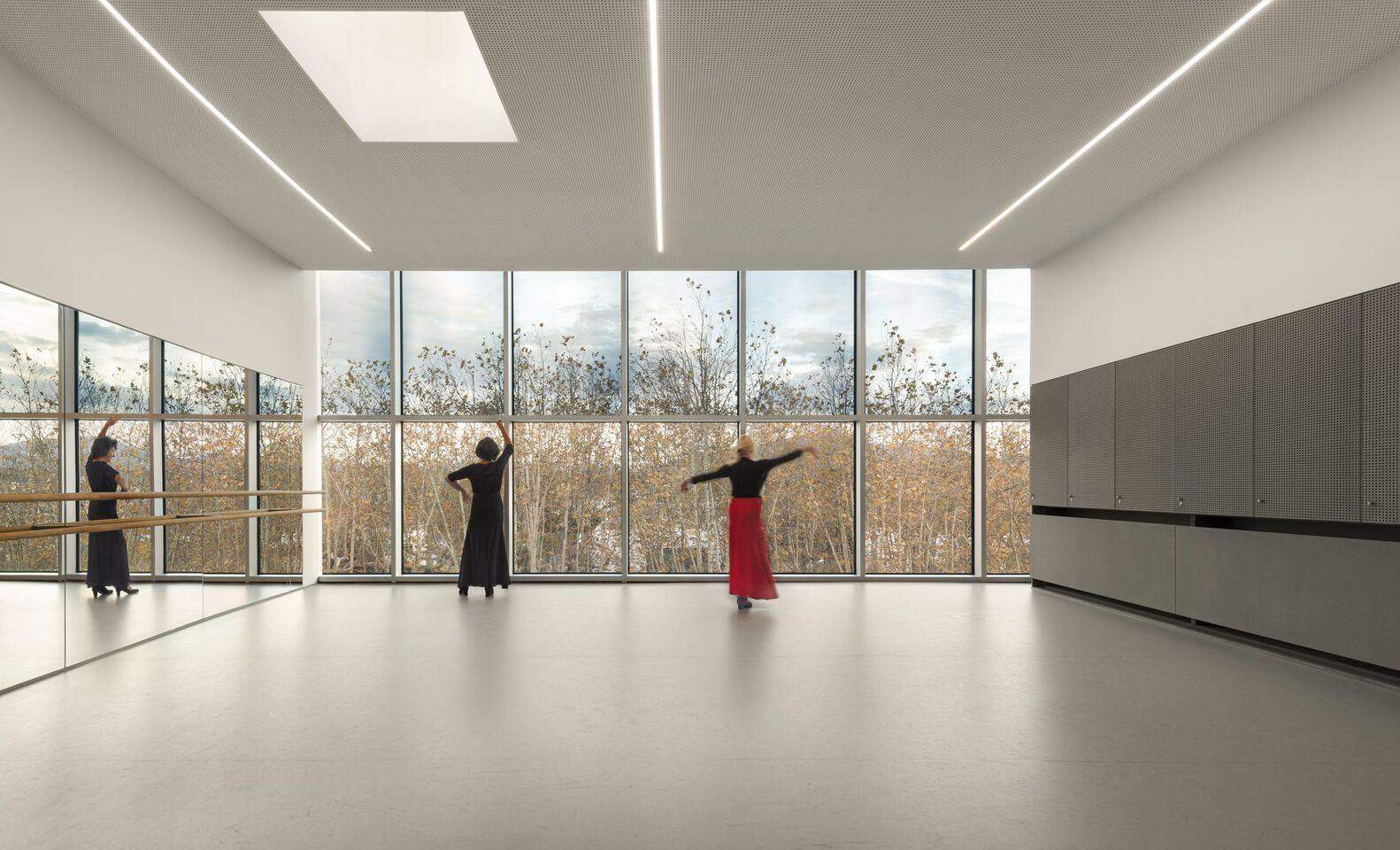 光影与内外空间的对话: 项目对自然光的运用堪称典范。大量玻璃幕墙的运用不仅引入了充足的自然光线,更将室外花园的景观引入室内,模糊了室内外空间的界限。这种设计手法使得建筑内部空间通透明亮,营造出一种开放、包容的氛围。 同时,建筑师还在室外空间设置了小型露天剧场,以及向外延伸的练习室,进一步加强了室内外空间的互动。这种对光影、通透性的极致追求,赋予了建筑独特的诗意气质,也提升了使用者在其中的体验感,实现了建筑与人的和谐统一。