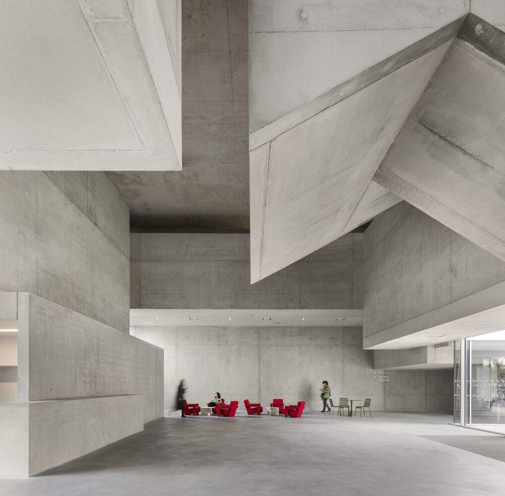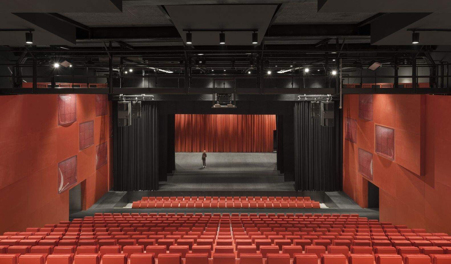 中庭像一个不言而喻的特征一样,在两个部分之间向上延伸:东面是一个巨大的剧院;在它的西面,有三层,包含叠加的部分——音乐学校、剧院和舞蹈工作室。这三倍的高度使这个地方显得高贵。中庭作为中心跳动的心脏脱颖而出,将建筑项目的所有功能统一在一个集体结构和一个共享场所中——一个团结和共存的中心。