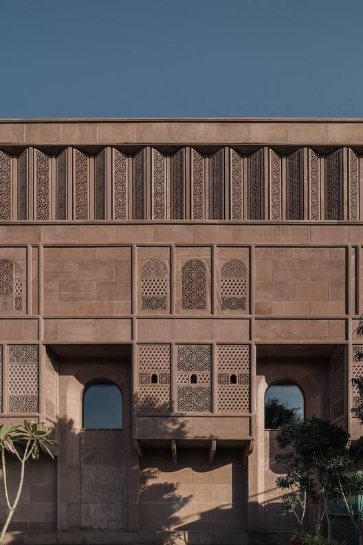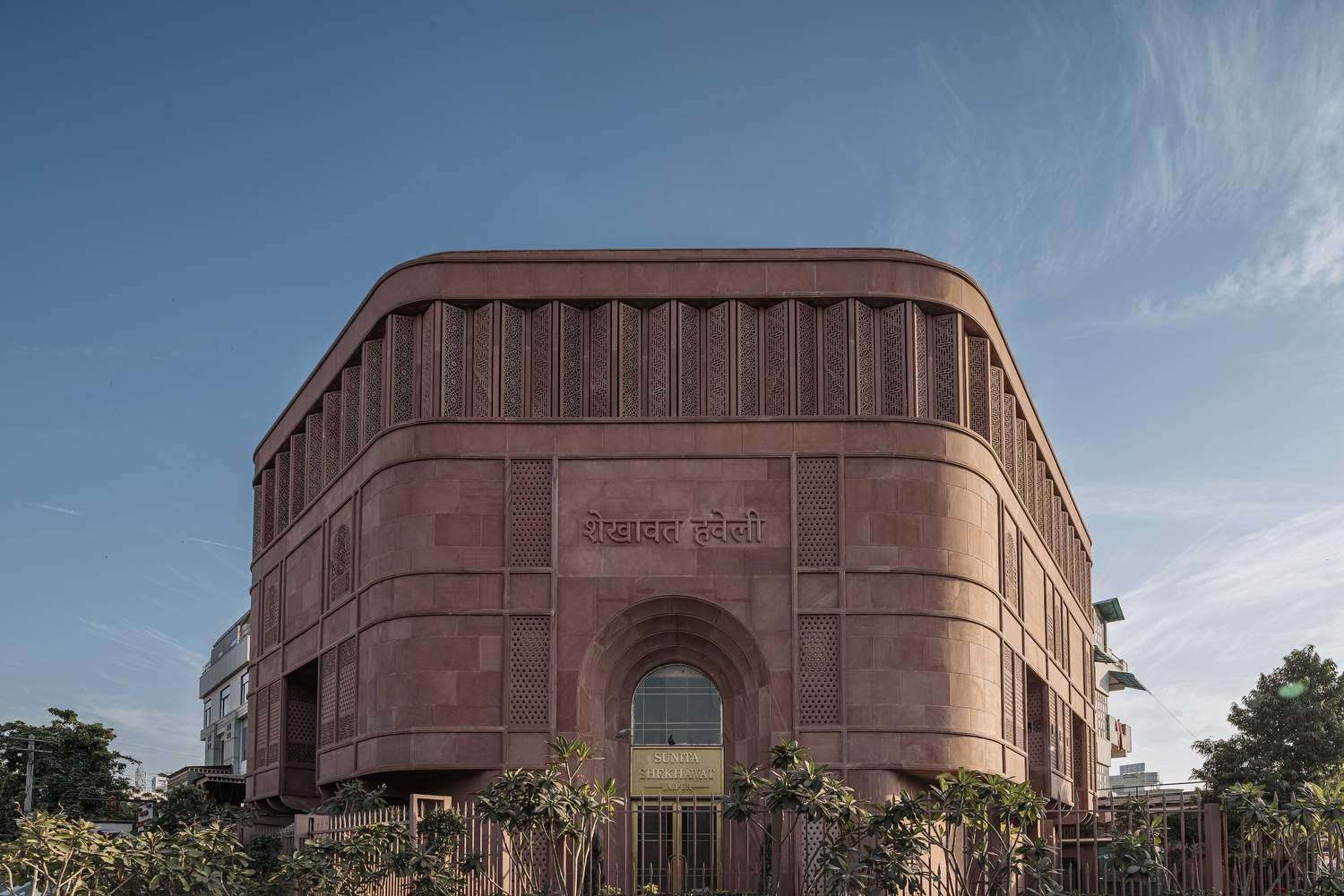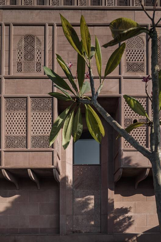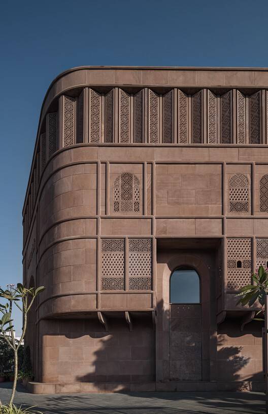 The oddly shaped footprint was externally articulated by bevelling the balconies and subsequently devising a form that intricately layers patterns and details that draw from different periods, woven together into one cohesive image. Externally, the ground and first floors are articulated to read as one through a double-height entrance arch in elevation. Clad in hand-carved Jodhpur red sandstone, the facade harks to Sunita' Shekhawat's roots in Jodhpur. While quite distinct in expression, it fits seamlessly into the pink palette synonymous with Jaipur's urban fabric.