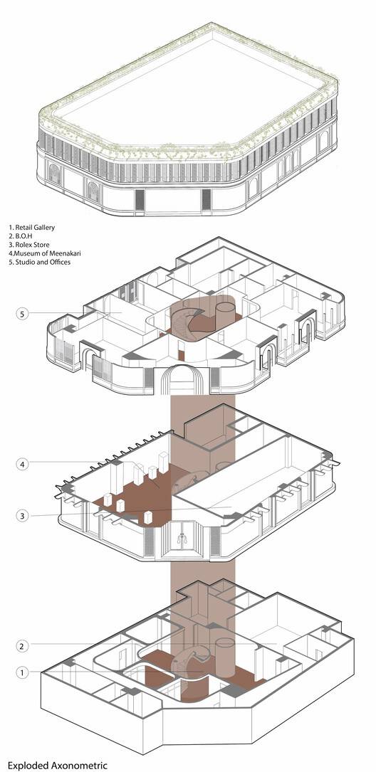 莲花工作室登船时,现场已经搭建了一个现有的混凝土外壳。工作室被全权委托拆除该建筑,并将该场地视为一块空白画布。由于它最近才被浇注在混凝土中,建筑师决定使用现有的外壳,以符合他们将隐含的碳足迹降至最低的设计理念。从程序上讲,一楼有一个博物馆画廊,商店位于下面一层,办公室位于上面一层。二楼旨在引入志同道合的奢侈品牌,而顶楼则可欣赏到附近Rajmahal Palace的全景,被设计用作餐厅。