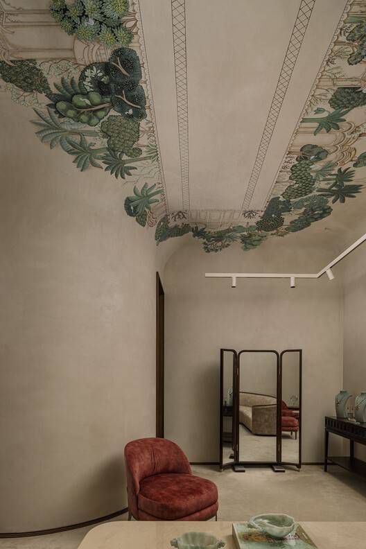 这些豆荚覆盖着一层灰白色的“阿拉什”石灰灰泥,半拱形的天花板上装饰着专门从事微型绘画的艺术家的壁画。这些壁画由12名工匠在现场创作了几个月,描绘了该地区建筑和动植物的小插曲。其结果——手工制作的奢华珠宝般的表达,赞美了该品牌的精神——证明了工匠们的技能,他们以一种陌生的规模和媒介诠释了这些技艺;建筑师、客户和CraftCanvas的Nisha Vikram之间的协同合作。其余的表面都是单色的,这样就不会在视线水平上分心于展出的错综复杂的珠宝。