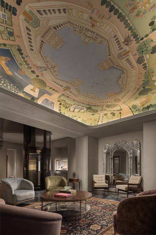 An existing concrete shell had already been erected on site when Studio Lotus was brought on board. The studio was given carte blanche to pull the structure down and treat the site as a blank canvas. Since it had only recently been cast in concrete, the architects decided to work with the existing shell, in line with their design philosophy of minimizing the embodied carbon footprint.Programmatically, the ground floor houses a museum gallery, with the store located one floor below and the offices a floor above. The second floor is intended for bringing in like-minded luxury brands, and the top floor, with its panoramic views of the nearby Rajmahal Palace, is designed for use as a restaurant.