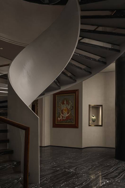 On the inside, the client's three floors are unified through a striking sculptural staircase that winds through the center of the space. The original brief outlined the retail space occupying the ground floor, the basement to house offices and karigars' workshops, and the remaining floors to be let out. The studio suggested to the client, the idea of using the ground level as an opportunity for the Sunita Shekhawat brand to own a storytelling space on the art of enameling—a fitting way of giving back to the arts and cultural heritage of the city—through the introduction of a museum-gallery that traces the provenance and history of Meenakari craftsmanship. This distinct addition not only serves as the fulcrum of the experience but also elevates the brand from a jewelry label to a custodian of the craft. The museum experience has been designed by Sidhartha Das, with the content curated by Usha Balakrishnan—a foremost expert on Indian jewelry traditions.