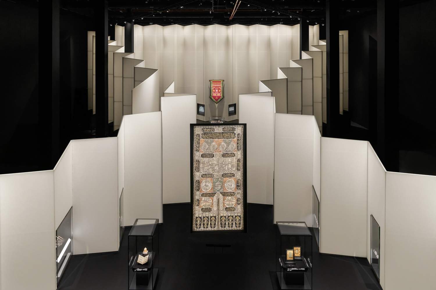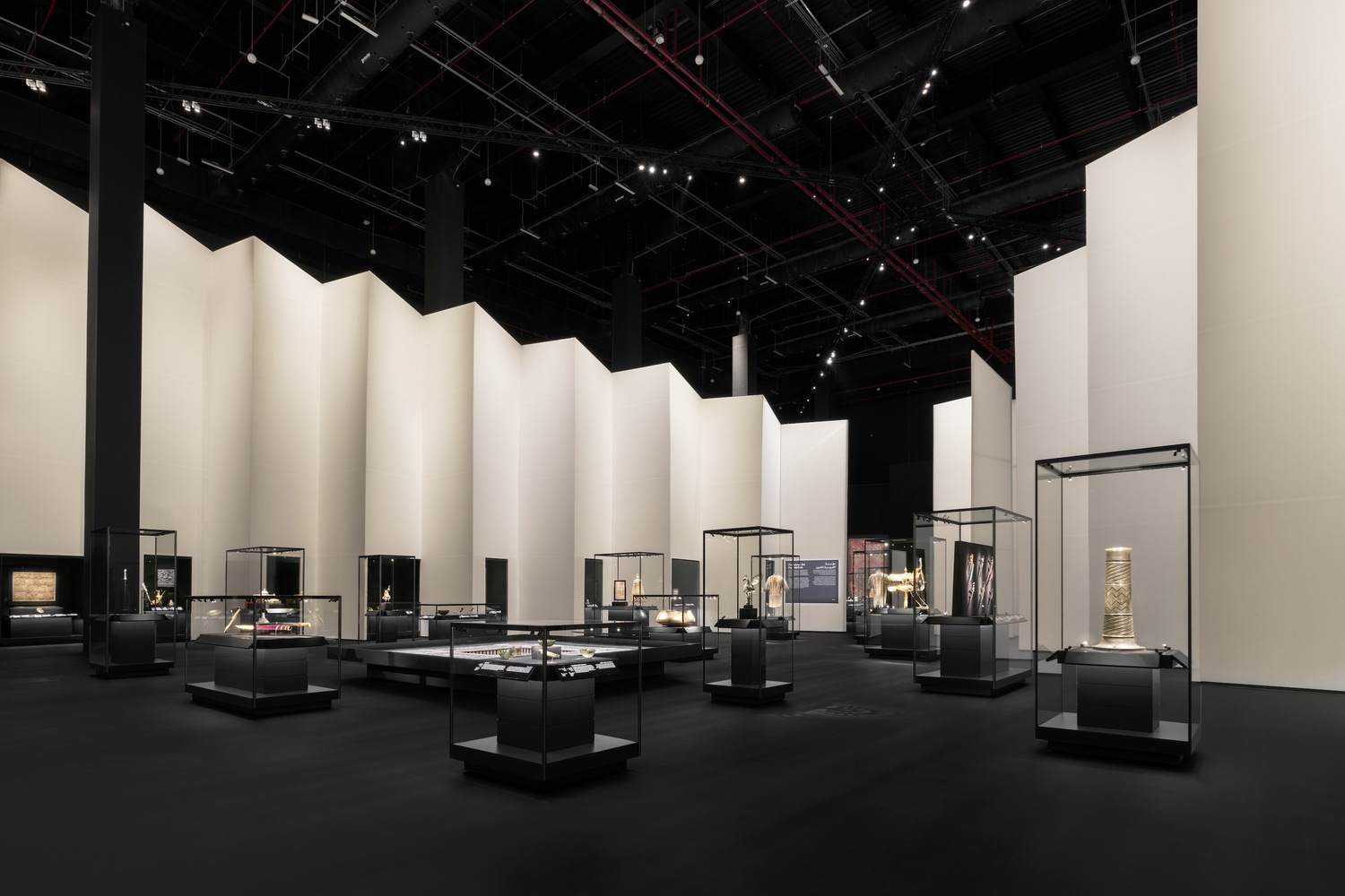 The scenography of AlMuqtani is designed to give equal importance to the two collections displayed in this section. A bowtie-shaped layout divides the gallery into two triangles of equal size, one for each collection. The triangles are defined by symmetrical pleated walls that ascend from eye level to the full height of the room. Each pleat hosts a vitrine, forming a seamless display front, revealed only as visitors circulate through the gallery.