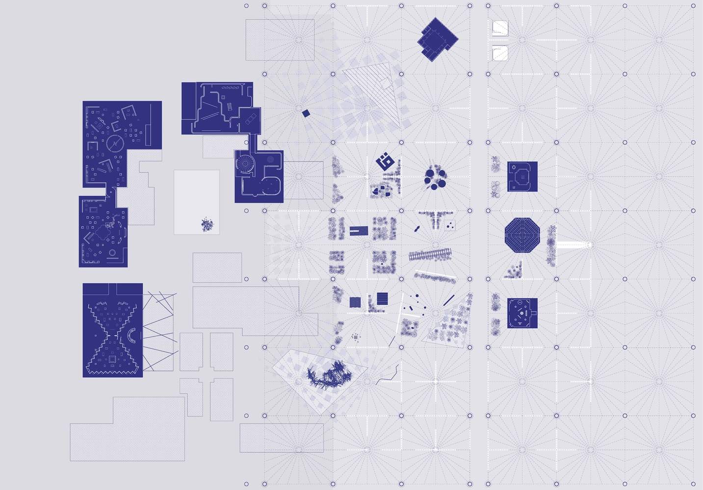 AlMadar, with contributions from 34 institutions in 21 countries, features a forest of 37 abstract rectangular columns. Made of concentric layers of translucent textiles and illuminated from below and within, they emerge as extrusions of the vitrines underneath, gradually fading into the ceiling's darkness. The density of columns helps visitors identify and navigate the thematic clusters and discover the participating institutions.
