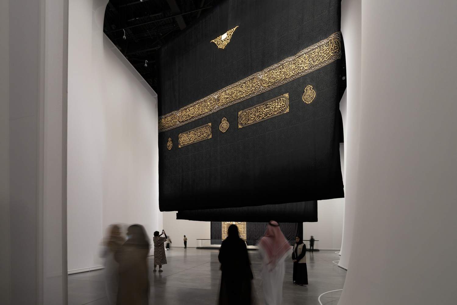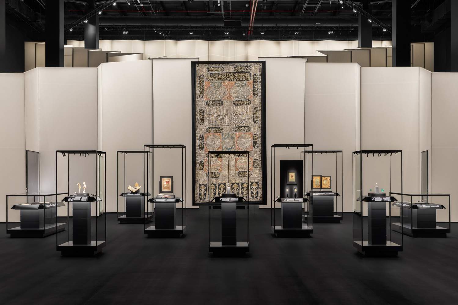 AlBidayah, dedicated to the sacred, consists of large and tall spaces defined by curved translucent walls that amplify the monumentality of the objects on display. The highlight of the section is the four Kiswahs of the Holy Kaaba, exhibited for the first time ever in their entirety. AlBidayah includes two pavilions under the canopy, AlMukarramah and AlMunawwarah, which showcase objects from Makkah and Madinah together with contemporary artworks. AlMukarramah is conceived as a dark space with a glowing white room at its center, while AlMunawwarah has a free-flowing, non-linear design.