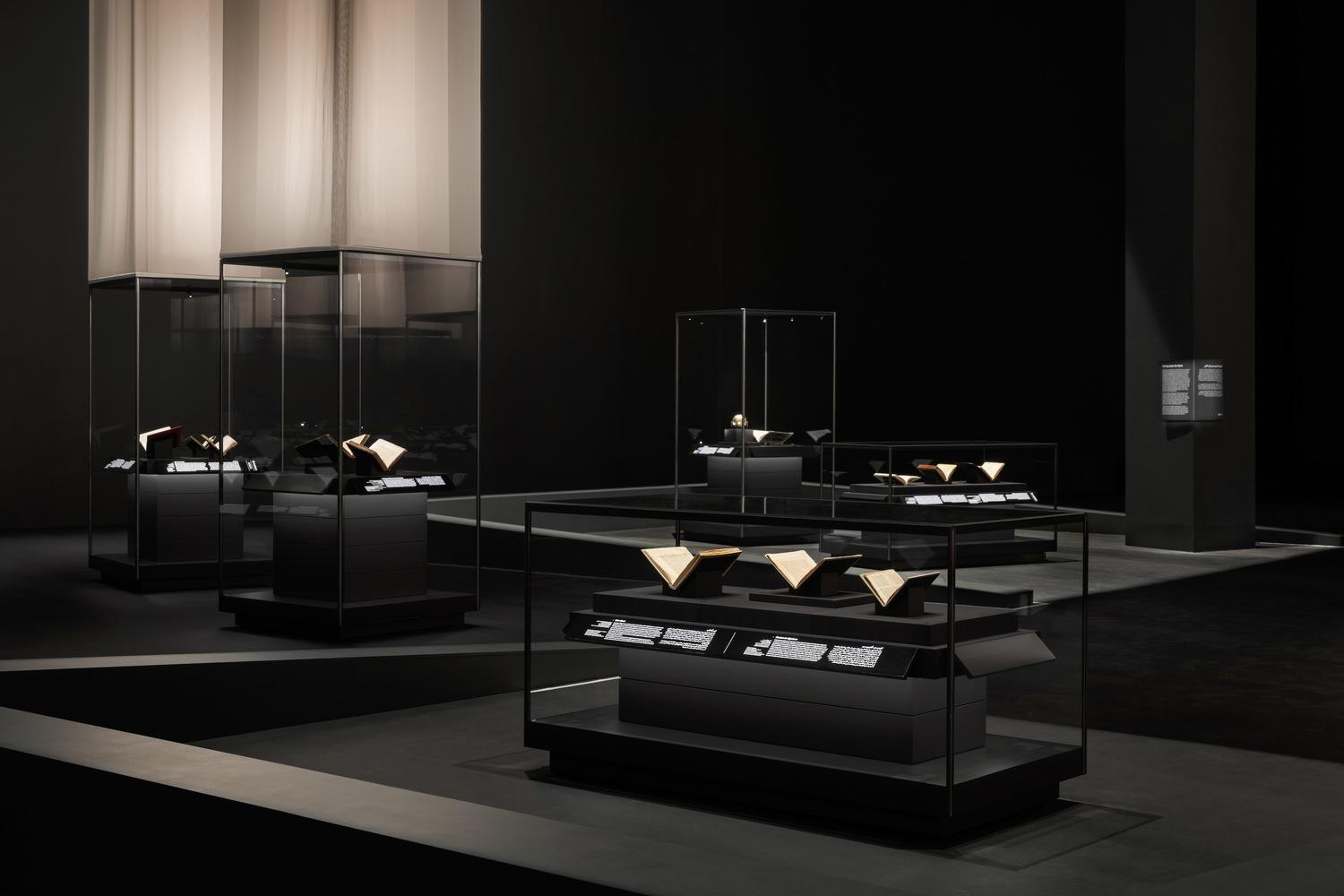 OMA's scenography unifies the exhibition through an environment of abstract forms that reinterprets archetypal architectural elements. The material palette is deliberately restrained: white fabric of various types is used throughout, with perceived color differences achieved through subtle variations in lighting. To create contrast, the frames of the vitrines are painted black, which echoes the color of many artworks and artifacts.