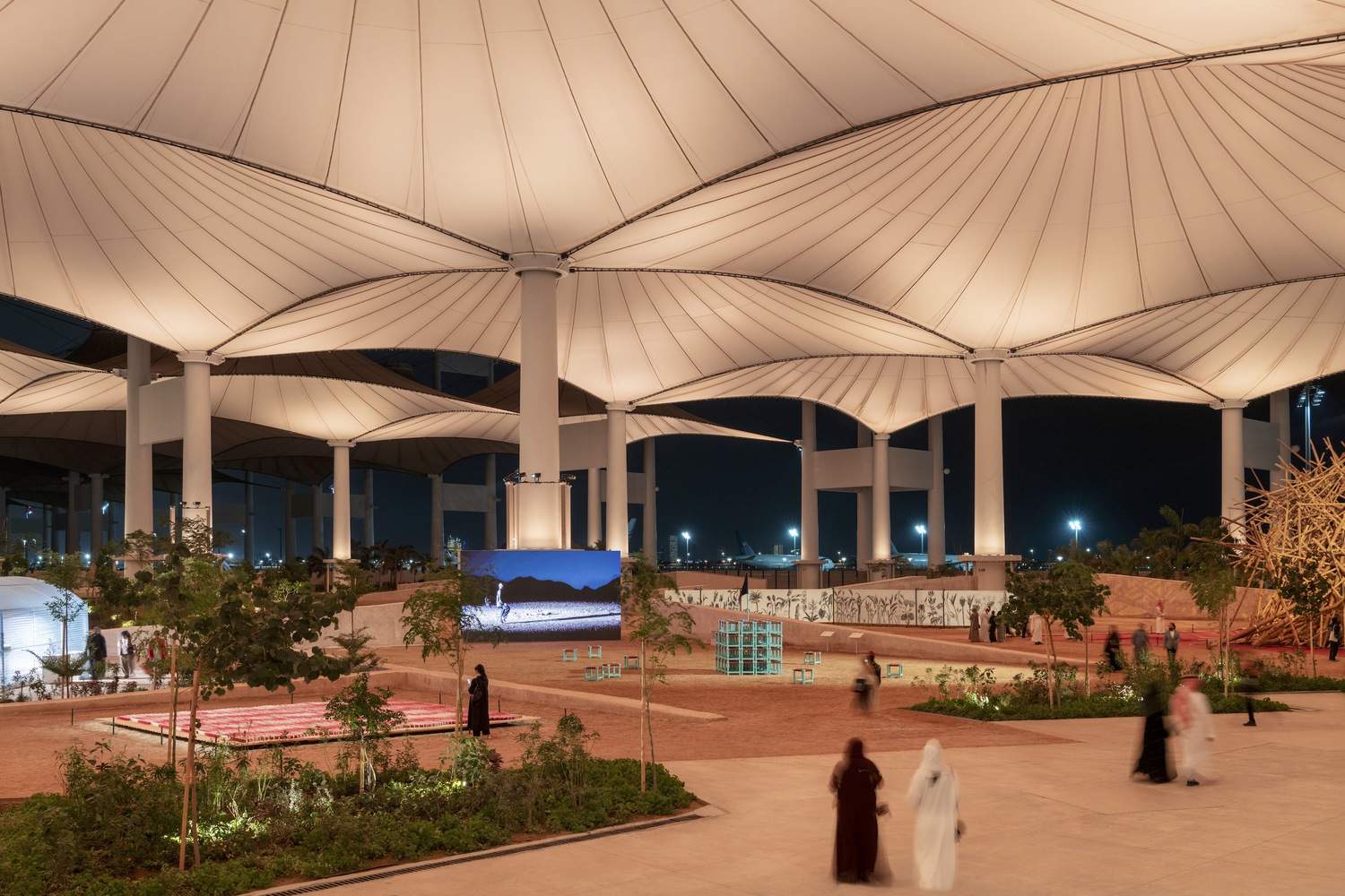 Text description provided by the architects. The 2025 Islamic Arts Biennale displays over 500 historical objects and 30 contemporary art commissions—more than double the content of the inaugural edition. Spread across five galleries, two pavilions, and the outdoor spaces under SOM's Hajj Terminal canopy, the exhibition is divided into three indoor areas—AlBidayah (The Beginning), AlMadar (The Orbit), and Almuqtani (Homage)—and the outdoor Almidhallah (The Canopy).