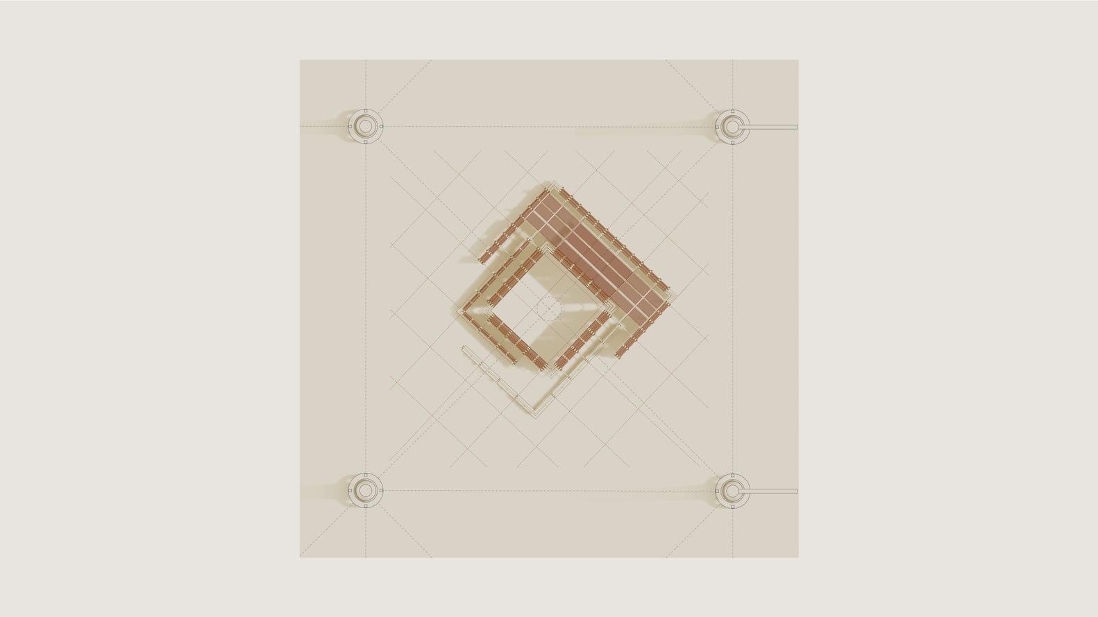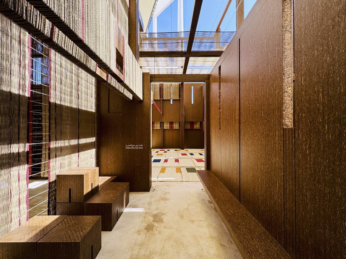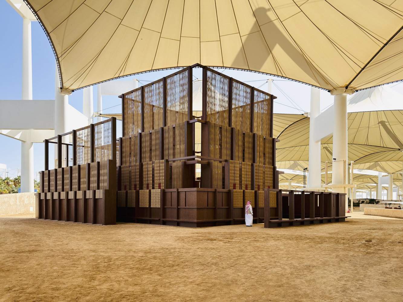 It brings together the legacy of courtyard typologies in places of worship, the tradition of using date palm trees as a building material in Saudi Arabia, and the art of weaving, referencing ancient textile-making techniques indigenous to the Gulf region.