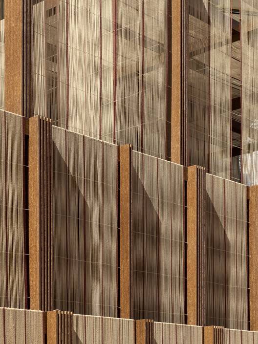 材料与工艺的创新运用:该项目最大的亮点之一在于对椰枣树的创新使用,将这种通常被视为废弃物的材料转化为碳负结构的建筑主体。这种选择不仅体现了对当地资源的尊重和可持续发展的理念,也为建筑带来了独特的视觉效果和质感。结合编织的工艺,建筑的立面呈现出通透而富于变化的纹理,既提供了遮蔽,又引入了光线。这种材料与工艺的创新,不仅提升了建筑的环保性能,也赋予了建筑独特的艺术表现力。这种“编织”的设计手法,巧妙地利用了光线、阴影和纹理,营造出一种既开放又私密,既现代又传统的空间氛围。