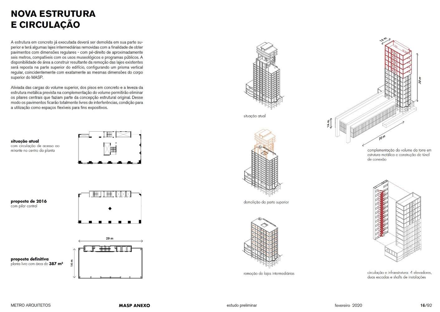 With 14 floors and an additional 7,821 m², the new building will increase MASP's exhibition capacity by 66%. The design respects the scale and language of Lina Bo Bardi's building and avoids competing with its monumentality. The volume consists of a rectangular prism on a transparent base, which preserves visual continuity with MASP's famous "free span".