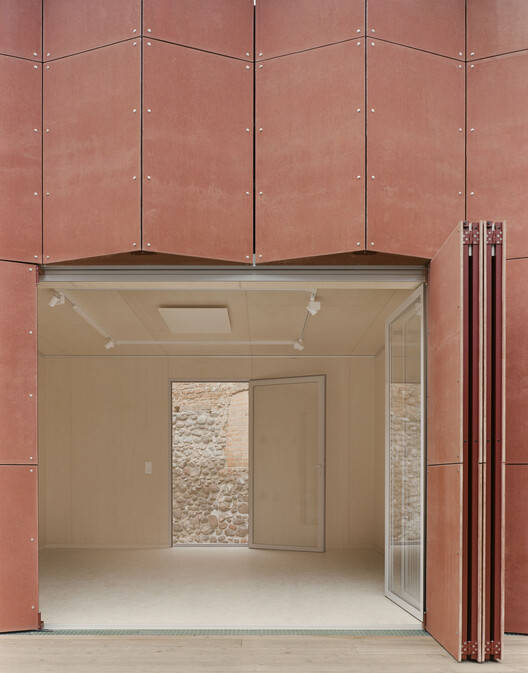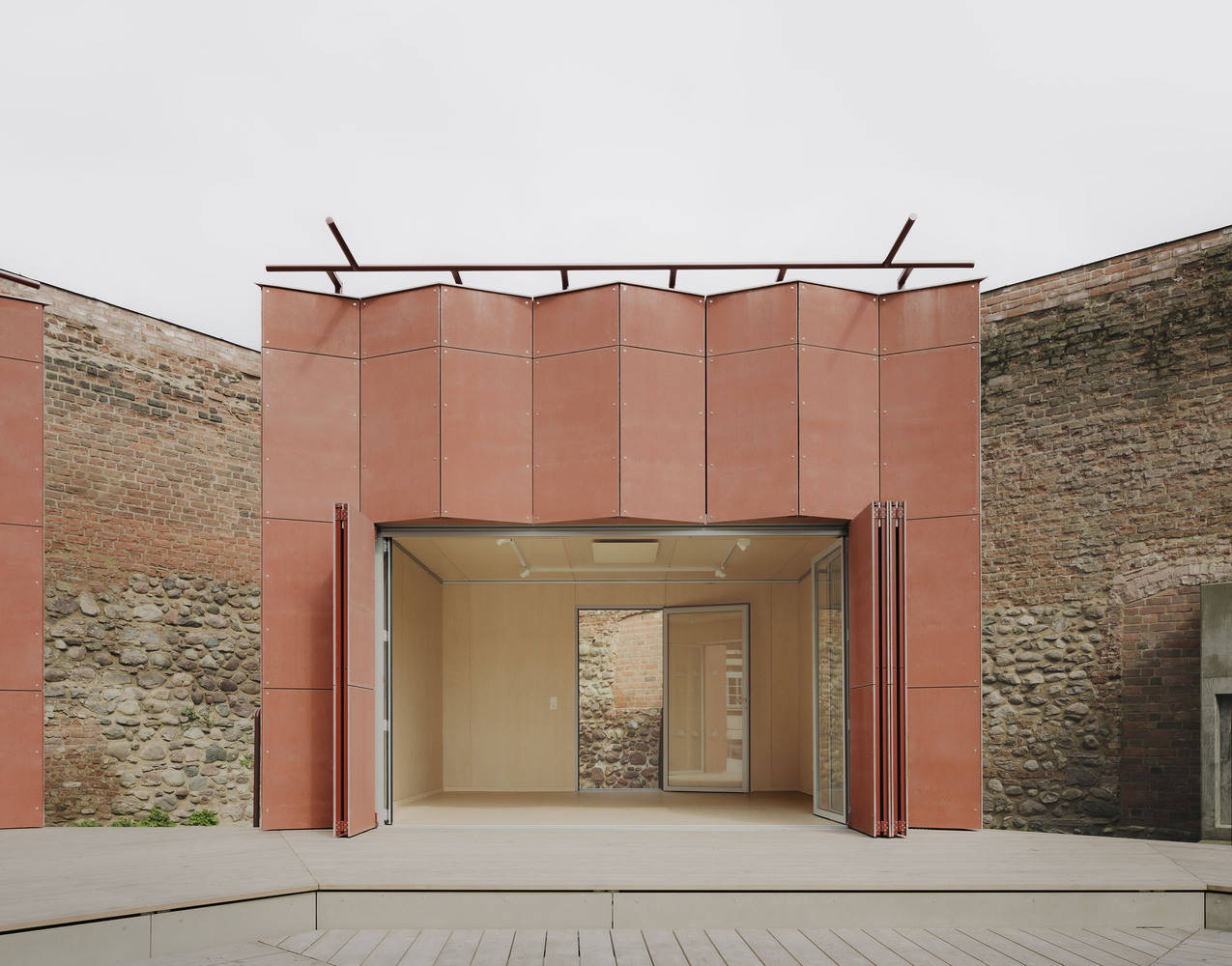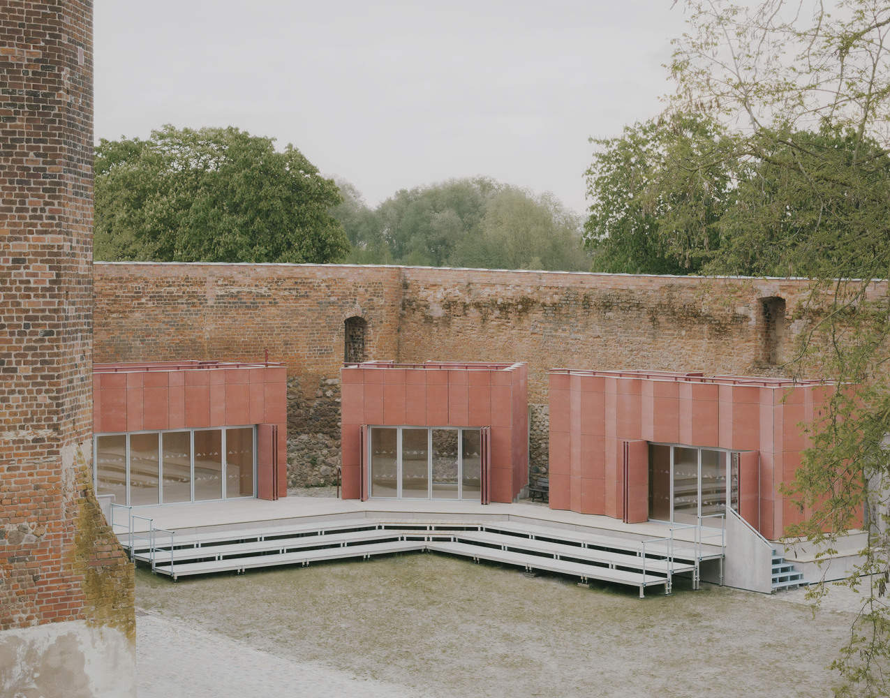 The construction prioritizes geo-based and bio-based building materials. Most of the work was carried out by a local carpentry firm, which is now in its third generation of involvement with the castle. The pavilions are elevated on point foundations set atop the historic paving, minimizing the use of concrete and preserving the historical fabric of the site. Built with a timber frame construction and insulated using wood fiber, the pavilions are suitable for year-round use, including as a gallery in winter. The folded, curtain-wall façade draws inspiration from the materiality and color of the red brick castle walls. Internally, the design is restrained and monochromatic, featuring light-colored wood and linoleum flooring.