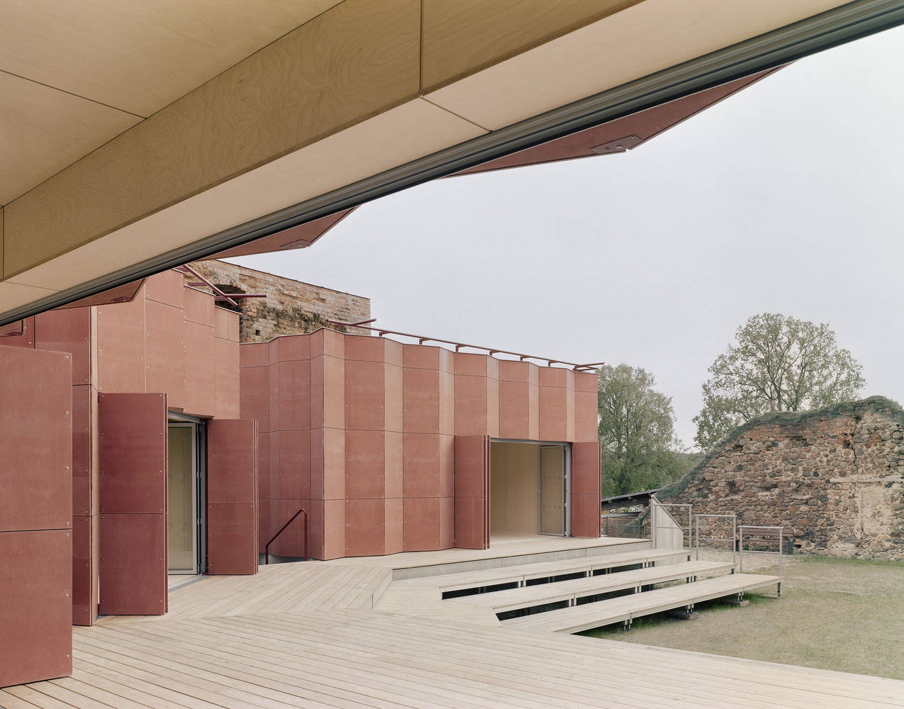 该建筑优先考虑基于地质和生物的建筑材料。大部分工作是由当地的一家木工公司完成的,该公司现在已经与城堡合作了第三代。展馆建在历史悠久的铺路石上的点状基础上,最大限度地减少了混凝土的使用,保护了遗址的历史结构。这些展馆采用木框架结构,并使用木纤维隔热,适合全年使用,包括在冬季作为画廊。折叠的幕墙立面从红砖城堡墙壁的材质和颜色中汲取灵感。在内部,设计是克制和单色的,以浅色的木材和油毡地板为特色。