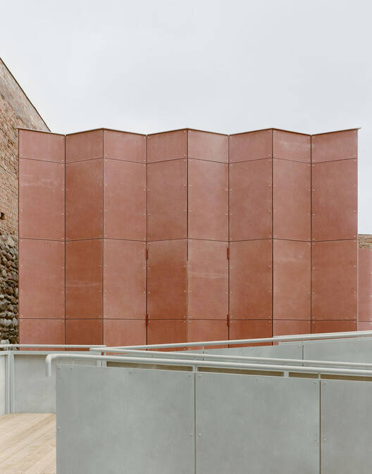 场地与历史的对话:该项目最引人入胜的亮点在于其与历史文脉的对话与融合。设计巧妙地将现代展馆置于中世纪城堡的中心,并非简单的堆砌,而是尊重并延续了城堡丰富的建造和再利用历史。建筑师通过最小化混凝土的使用、采用点状基础等方式,最大限度地保护了遗址的历史结构。折叠幕墙立面从红砖城堡墙壁的材质和颜色中汲取灵感,使得新建筑与原有建筑在视觉上形成呼应,既是对历史的致敬,又展现了当代建筑对传统的理解与创新。这种细致的尊重和巧妙的对话,赋予了项目独特的文化深度。