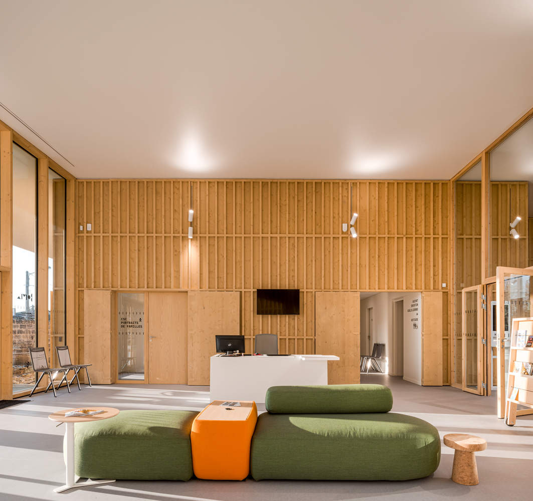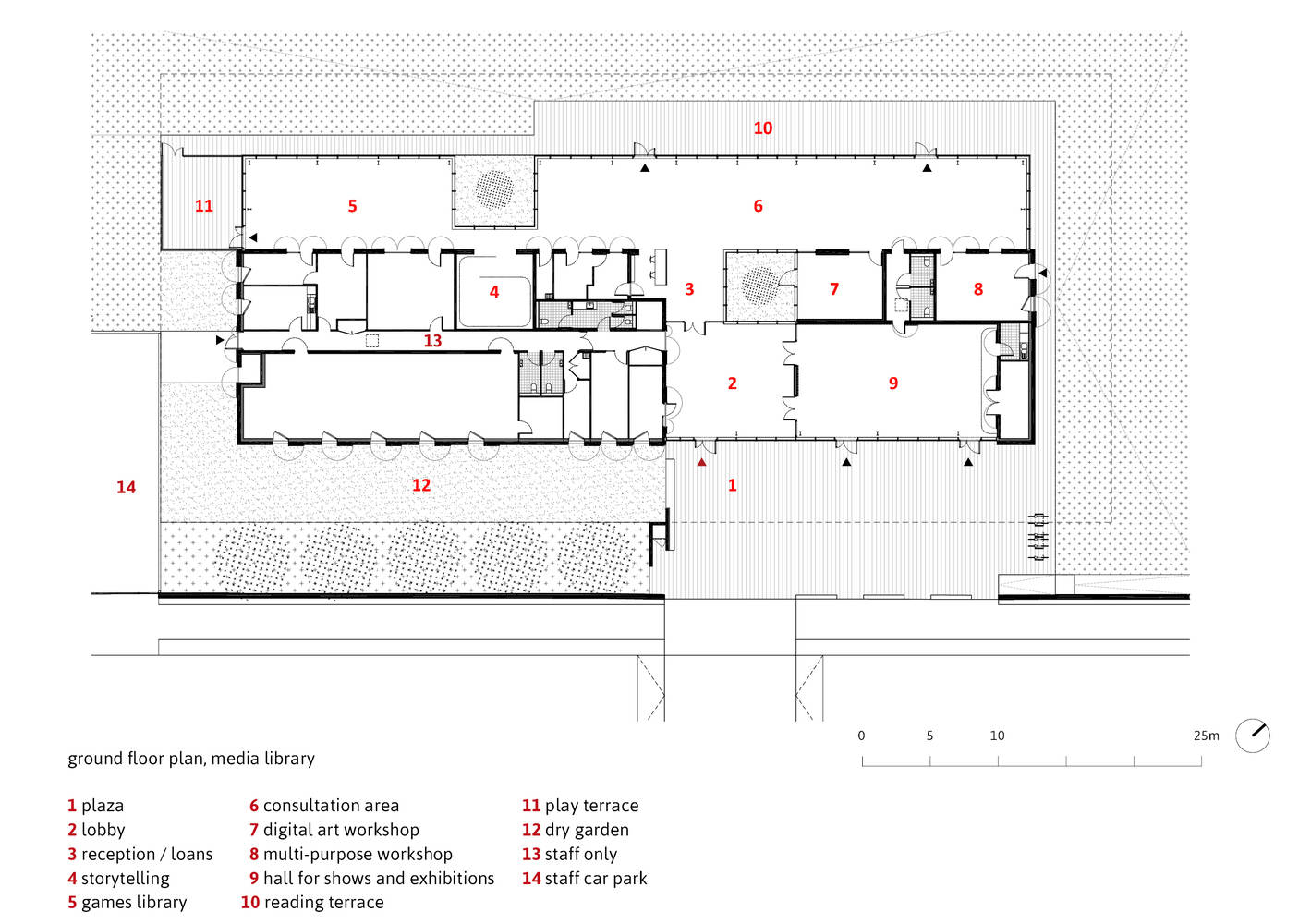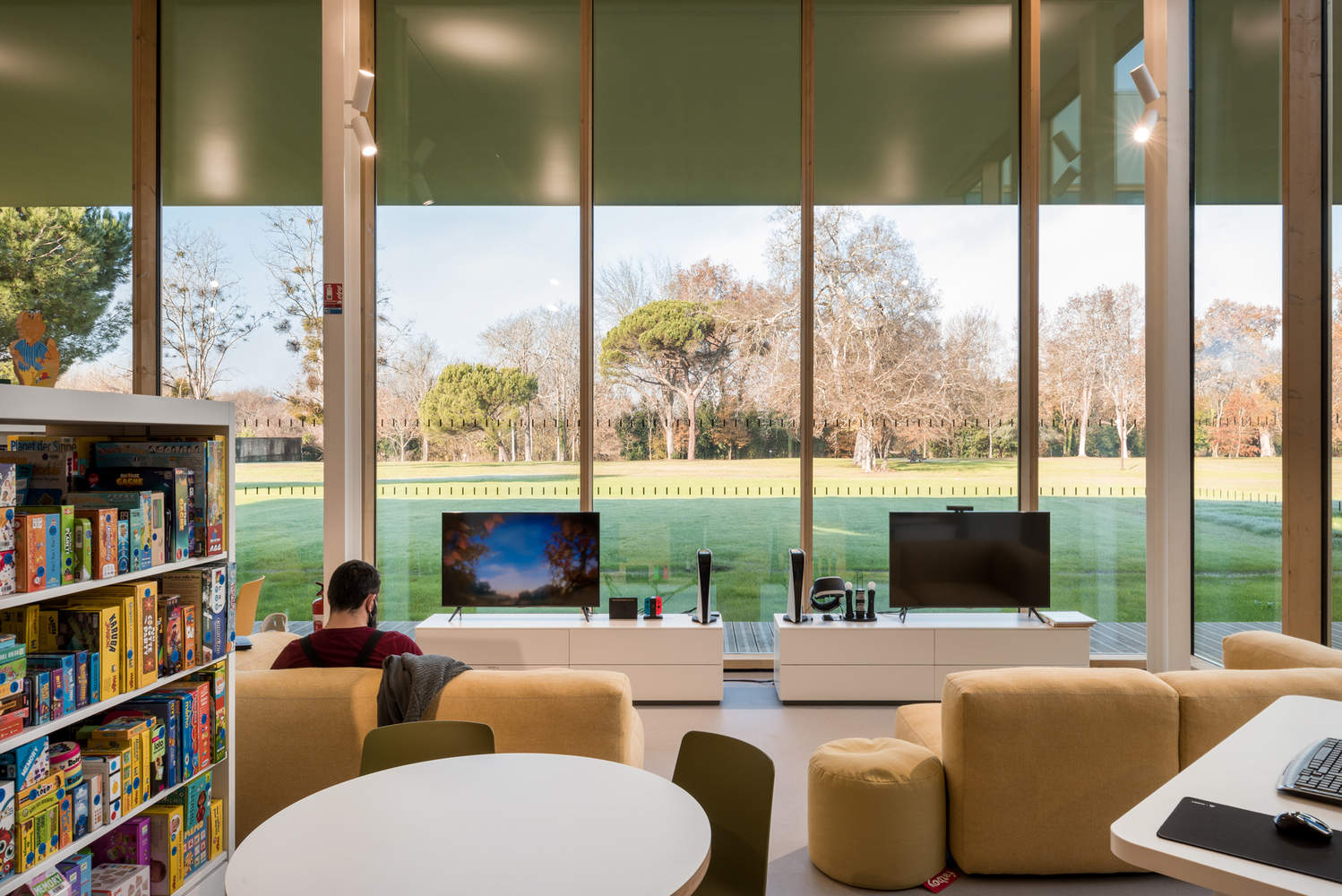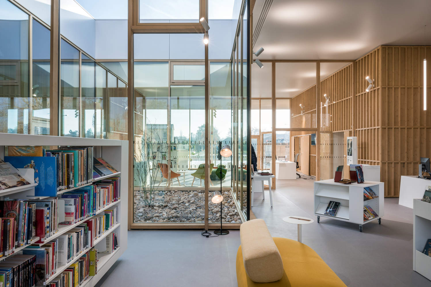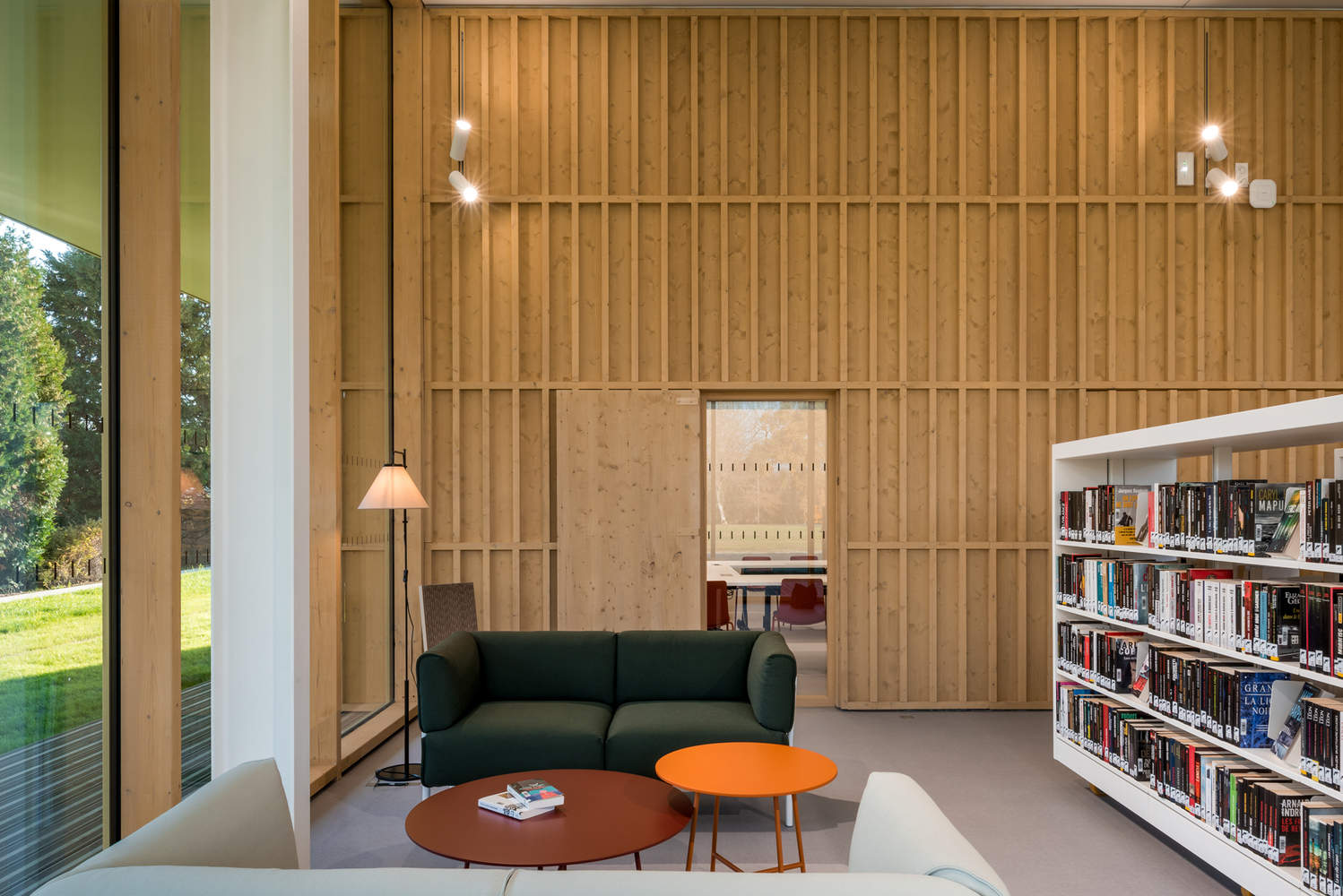 The transparent façade next to the main entrance makes it possible to see right through the building from the street, creating a sense of visual continuity between the public space and the park. Designed as a third place where different activities and different audiences mingle, transparency is also used to enable and promote interaction. From the entrance and reception onwards, the transparency of the public areas – laid out around two patios leading from the plaza towards the park - invite people to walk around and discover the center. Some of the spaces, such as the kids' storytelling area or workspaces, offer a quieter, more private environment while retaining a visual relationship with the rest of the center. On the park side, the entirely glazed facade opens onto the landscape of the large meadow, while the reading terrace provides users an extension of the interior spaces.