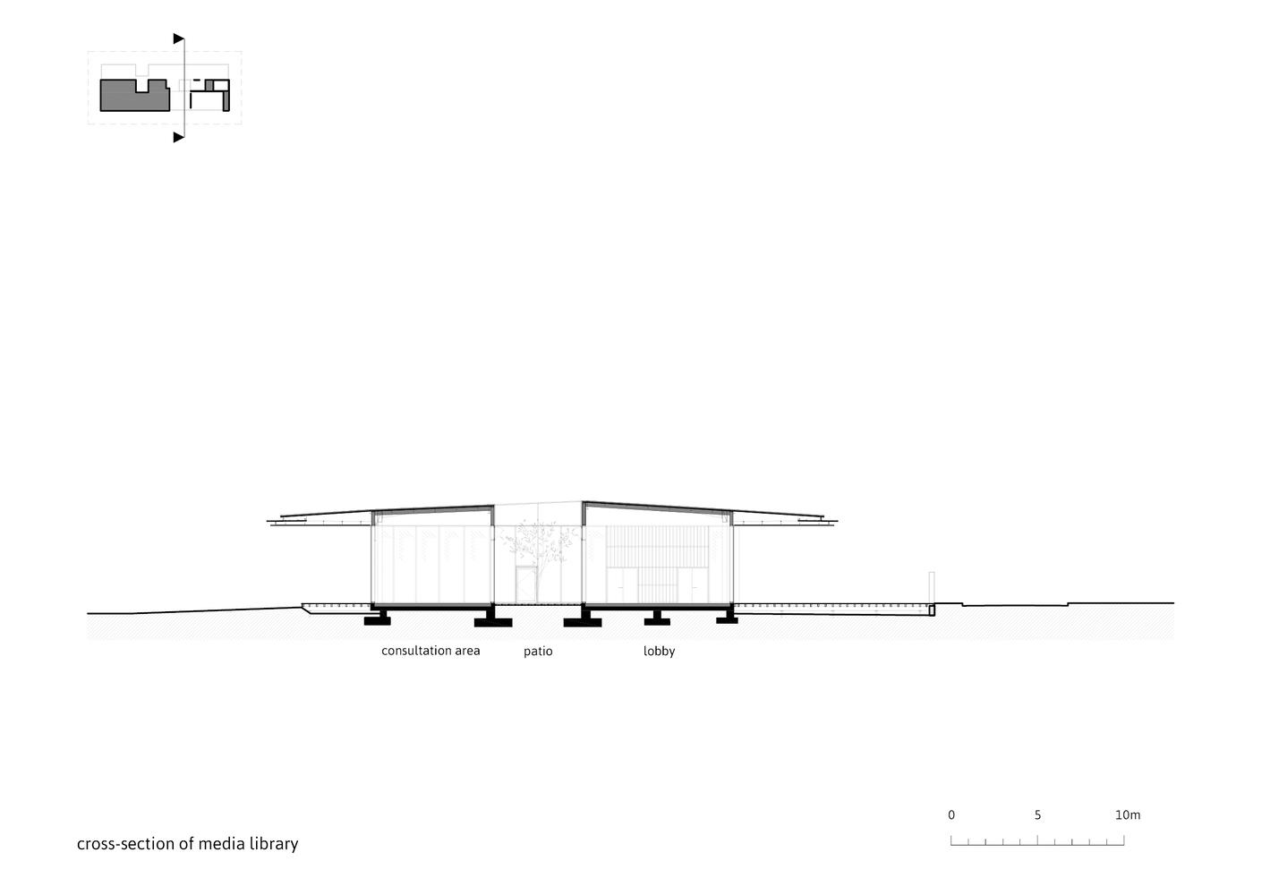 主入口旁边的透明立面使人们可以从街上看到整个建筑,在公共空间和公园之间创造出一种视觉连续性。设计为不同活动和不同观众混合的第三个地方,透明度也被用来促进互动。从入口和接待处开始,公共区域的透明度——围绕着从广场通往公园的两个露台——邀请人们四处走走,探索中心。一些空间,如孩子们的讲故事区或工作区,提供了一个更安静、更私密的环境,同时与中心的其他部分保持了视觉关系。在公园一侧,完全玻璃化的立面通向大片草地的景观,而阅读露台则为用户提供了室内空间的延伸。
