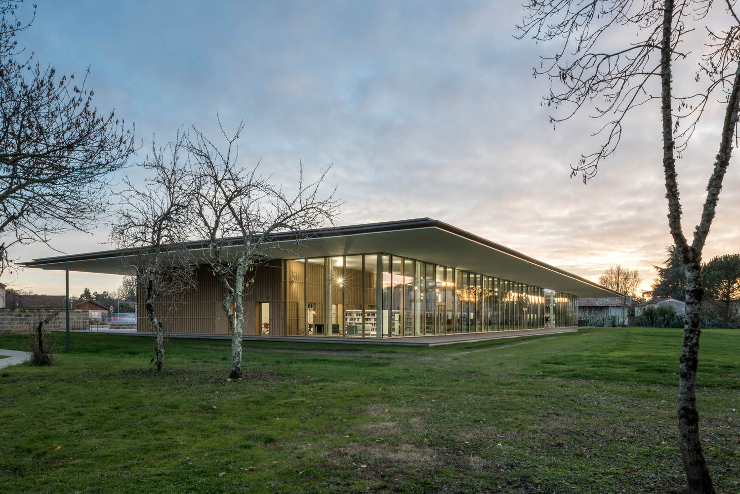 We wanted the project to blend discreetly into the landscape while ensuring that it was easily identifiable as a major local public facility, so we used the nature of the site and its surroundings to propose a restrained, pared-back composition that enhances the intrinsic atmosphere of the site and converses with both its built environment and the landscape. Located along the stone perimeter wall of the estate, the media library acts as a signal marking the entrance to the park. It takes the shape of a ground-floor building made up of two horizontal lines that frame the landscape: the wooden terrace and the six-metre-wide cantilevered roof overhang running all the way around the building. In terms of materials, the transparency of the glass combined with the warm aspect of the wood, allows the project to be subtly integrated into the landscape.