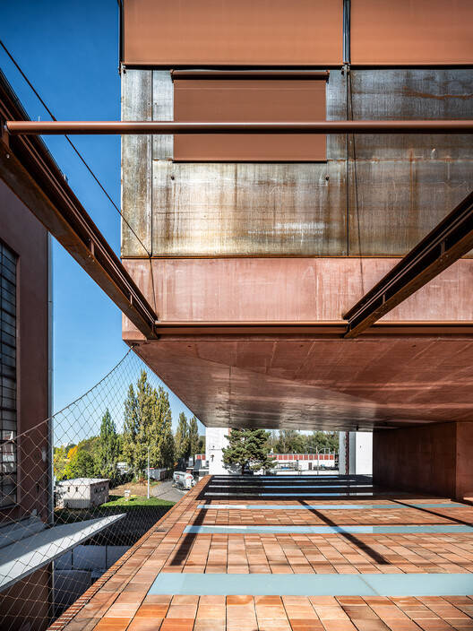 When solving the object, we asked ourselves the question of the truthfulness of the architectural expression. Our answer is recognized construction and material design. Where we see the bricks are actually masonry load-bearing walls, where there is exposed concrete, it is a load-bearing concrete structure, and where there is weathering-steel sheet cladding, there is a non-load-bearing shell of panels. The effort was to design a coherent material design in the interior and exterior. The lower part of the gallery is brick, and thus follows the industrial construction of the mills. Brickwork not covered with plaster does not only mean a reference to a monument-listed building, but it is a natural effect of the wall itself, which plays a central role in shaping the space. It is a "bare" wall that does not need to be covered, but requires careful craftsmanship. The same can be said about other structural elements, such as ceilings, walls, and floors. The entire building tells us what and how it was really made. We colour matched all the materials to the brickwork. In the case of concrete, almost 30 different samples in the form of cubes had to be cast before the colour could be mixed. We decided to wall these cubes into the brickwork in the entrance hall as a memory of finding the right shade. In the case of the workshops, we used coloured concrete for the structures and floors. The construction of the workshops is based on load-bearing concrete ribs in a grid of 3 × 3 meters, which support X-beams at the edges near the façade. We are helped to bridge the nine-meter spans by one-meter beams with openings that allow the installation of approved distribution systems in the interior. Thus, classrooms do not have to have additional internal supports. X-beams are a kind of hybrid perforated wall, which at the same time ventilate the entire building around the perimeter. Light panels with insulation, covered with weathering-steel sheet, are placed on the outside.