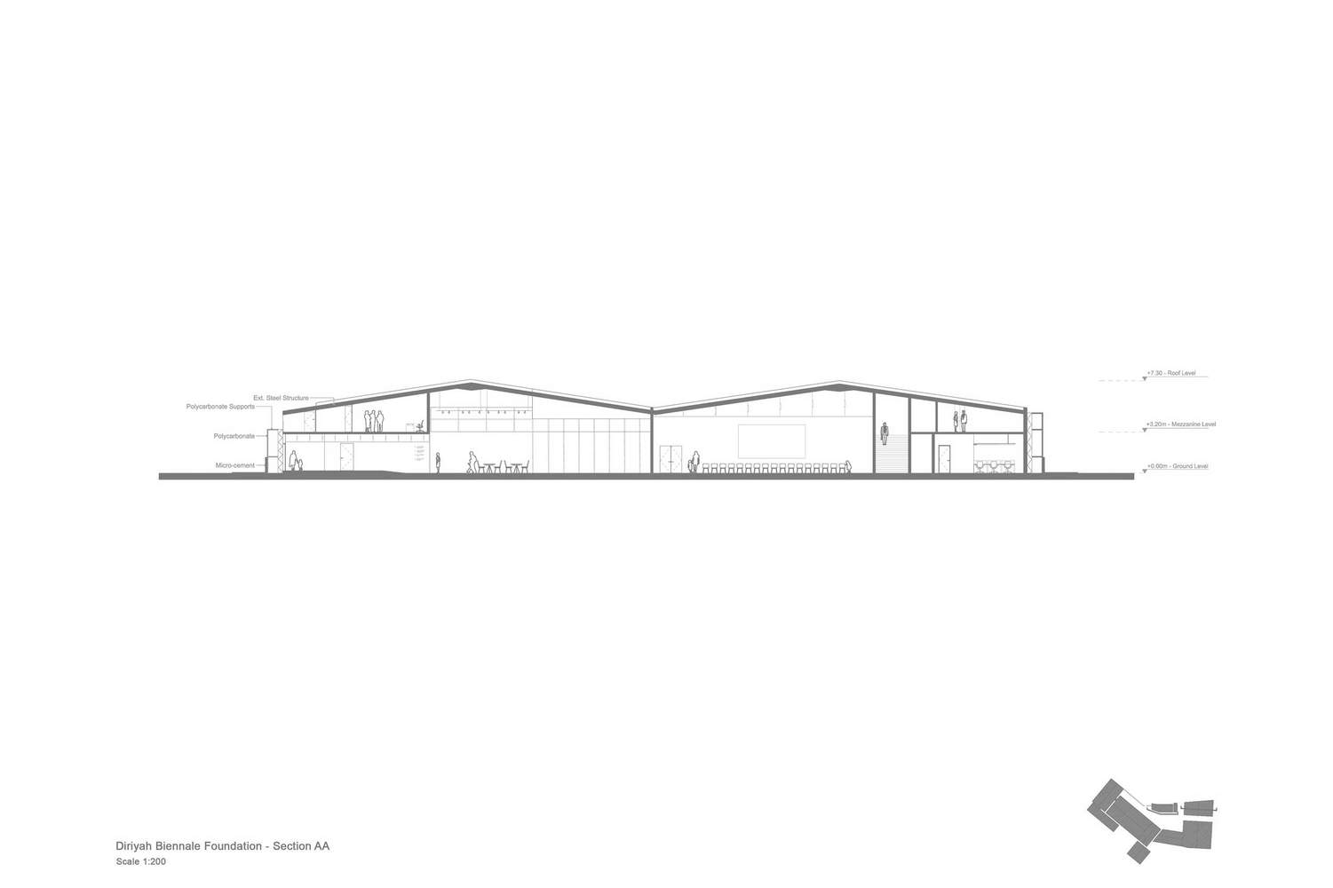 建筑师提供的文字描述迪里亚双年展基金会是沙特阿拉伯致力于推广该地区及其他地区的当代和伊斯兰艺术的主要机构。Bricklab成立于2021年,在利雅得JAX创意区总部的设计和建设方面赢得了国际比赛。作为该地区首批主要租户之一,该基金会呼吁修复8个退役仓库,总面积16000平方米,以容纳世界级的画廊、艺术处理设施、公共工作室、办公室、礼堂和多功能广场。