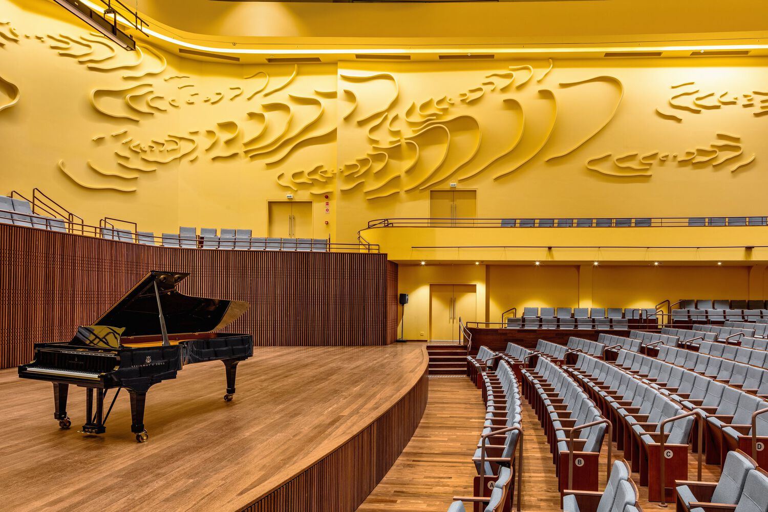 艺术与技术的完美结合:该项目不仅仅是建筑设计,更是一件艺术品。迪·卡瓦尔康蒂的壁画,桑德拉·辛托的挂毯,与建筑本身融为一体,共同营造出一种独特的艺术氛围。这种艺术氛围的营造,并非仅仅依赖于视觉元素的堆砌,而是与建筑的声学设计、功能布局紧密结合。声学设计师与建筑师的合作,保证了每一个细节都服务于音乐的体验。这种艺术与技术的完美结合,使得该项目不仅是一个剧院,更是一个能够激发人们情感共鸣的文化场所,充分展现了建筑的综合艺术价值。