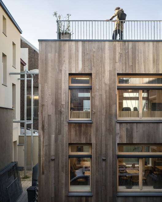 Text description provided by the architects. The new Greenpeace Belgium HQ is located in a dense building block in the city center of Brussels. The existing structures used to belong to an old organ atelier, called Manufacture d'Orgues de Bruxelles. To uncover the qualities of the factory building, a process of 'matchmaking' resulted in an innovative approach towards the programming of the new offices: the existing structures, as well as the interior and surrounding climates, were analyzed and matched with specific activities from the Greenpeace team (from formal meetings to wall climbing), resulting in a low-tech project and a high-quality work environment.