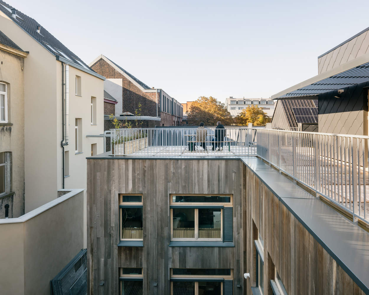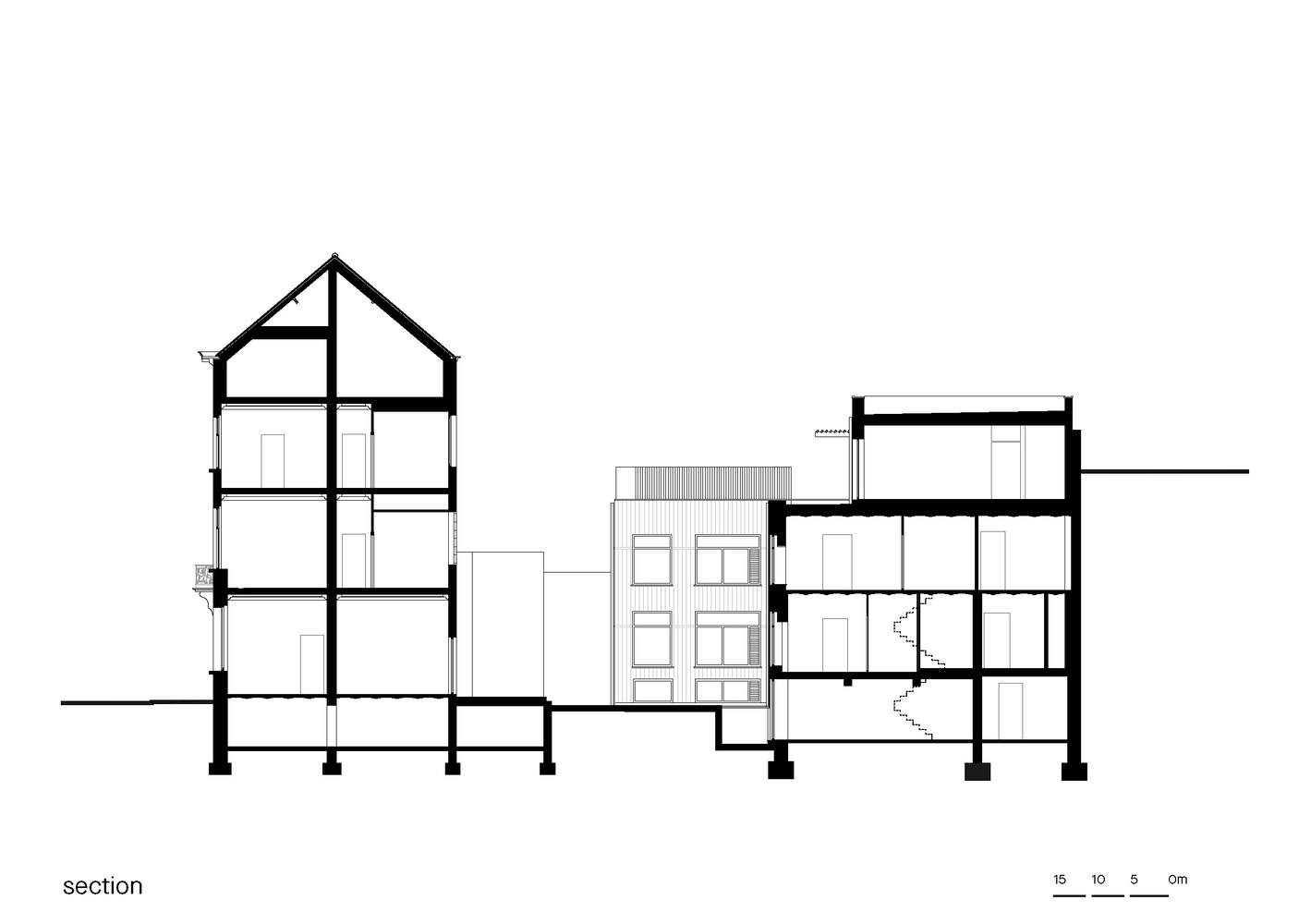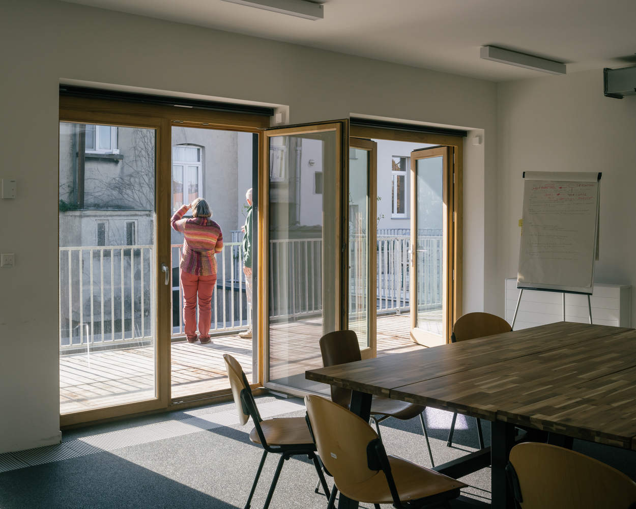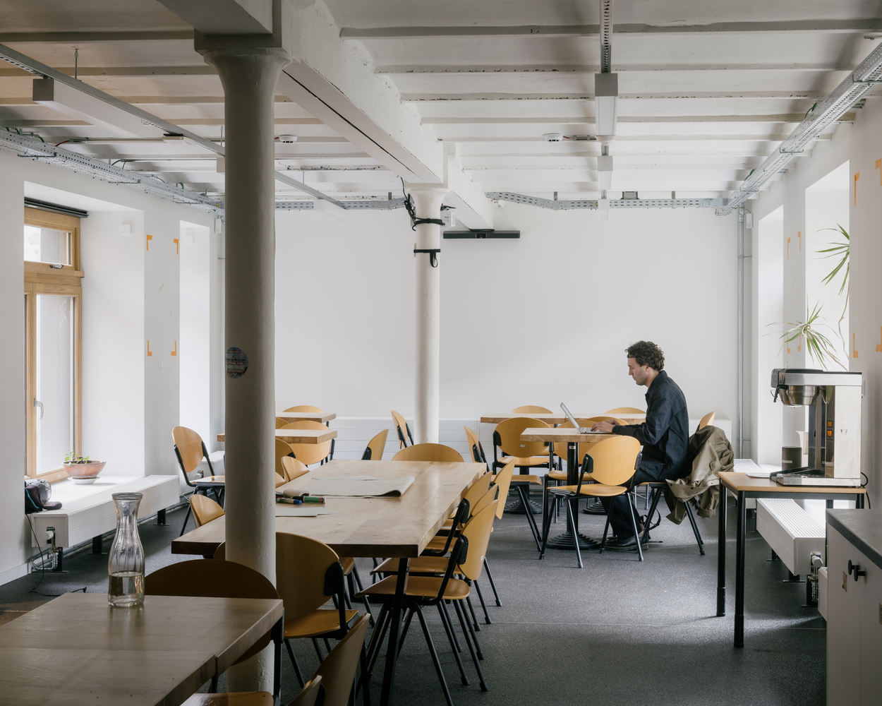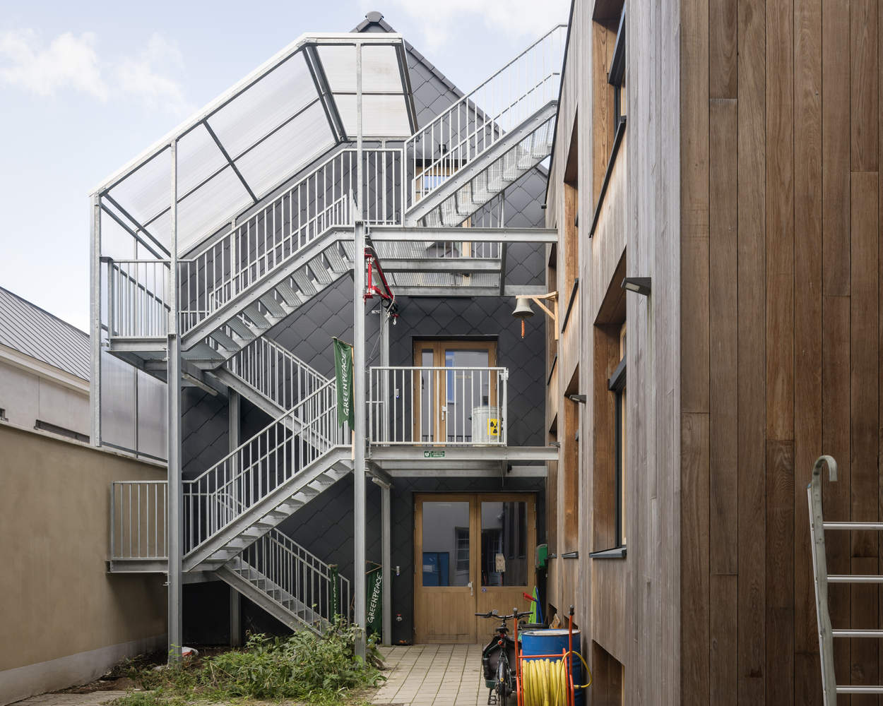 Match-Making - Low impact environmentally should have a high impact architecturally. The choice to preserve, renovate, and transform is not only critical for the mitigation of embodied carbon, but it also challenges us to play out the phenomenon of incremental bricolage to uncover a great diversity of spaces. Following our aim to match existing structures and energy flows with specific activities, we made some evident choices for the program of the project, like the old organ atelier in the back that becomes the workshop for Greenpeace activists or placing the guest rooms in the row houses in front. However, in between front and back, we designed an elaborate sequence of indoor and outdoor spaces, public and private areas, and more or less conditioned interior climates, providing multiple spatial options for the dynamic and ever-changing organization of Greenpeace.