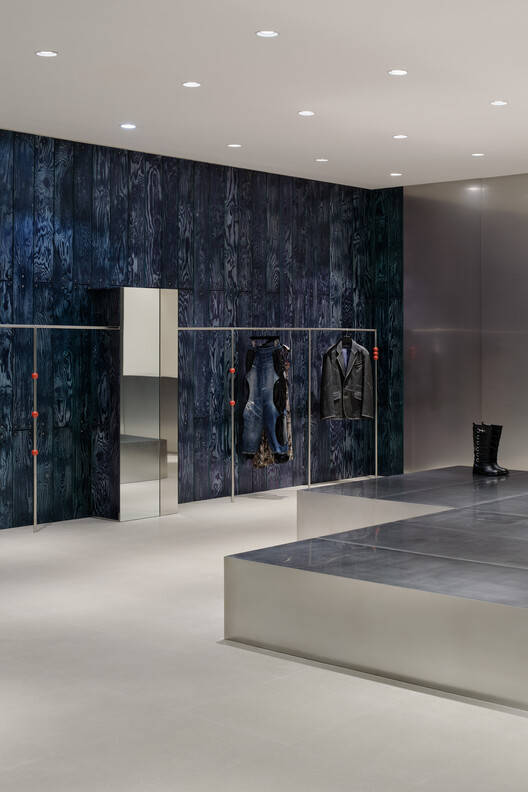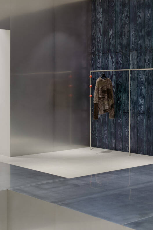 Text description provided by the architects. The design began with the question, "How can we introduce variations while maintaining minimalism?" We minimized visual distractions while creating a space that conveys a rich and dynamic expression. By incorporating sturdy metal elements, we explored configurations that could display clothing and accessories effectively. The metal panels at the front reinforce a cool and repetitive aesthetic.