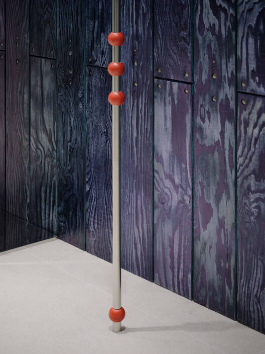另一方面,两侧的木板都用变色龙颜料处理,根据观察角度产生了变化的色彩。这允许背景的亮度和色调随着空间内服装视角的变化而变化。此外,衣架的高度可调,衣架上俏皮地添加了红色珠子,为原本会感到寒冷的空间注入了一丝智慧。