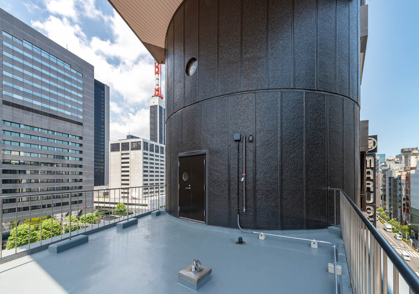 In particular, given the unique structural system, seismic retrofitting was planned to maximize the reinforcement effect while minimizing the space required by identifying the building's weak points through seismic response analysis. Carbon fiber sheets were attached to the cylindrical core wall legs (around the first floor) from the inside as bending reinforcement and thin steel plates were installed as shear reinforcement for the lower floors (first to fifth floors.) This allowed for a significant increase in earthquake resistance while maintaining the building's original form and also ensuring the usability of the small spaces.