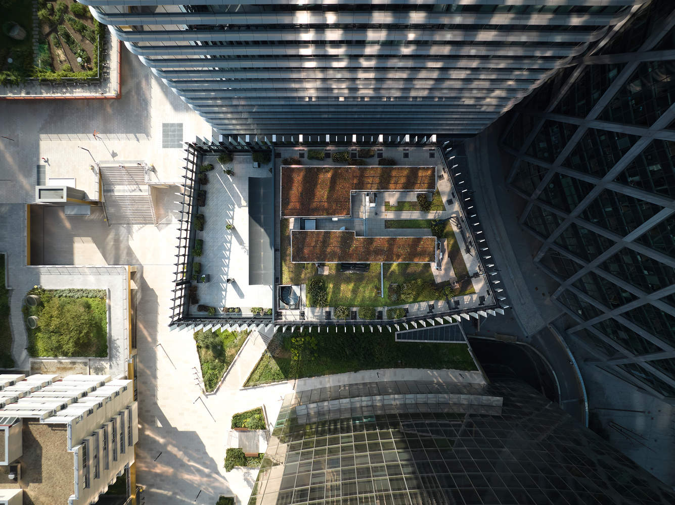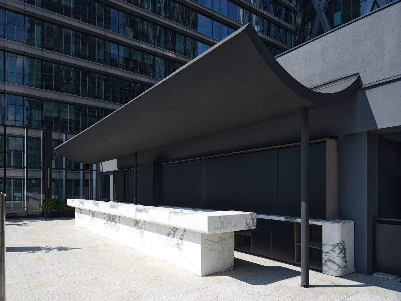 The Pavilion is surrounded by three towers, reaching heights of 100 and 200 meters, which overshadow its location. Only its southern façade opens onto Place de l'Iris and the historic axis of La Defense. To offer a fresh perspective on how this district is inhabited and experienced, the Pavilion's design is guided by two organic principles: - An innovative lifestyle program dedicated to the users of the Aurore Tower and surrounding buildings, the Pavilion provides versatile and inviting spaces for work and leisure. These include shops, restaurants, a business center, an auditorium, lounges, coworking areas, and a rooftop. A living architecture shaped by free movement. Inspired by the image and function of a lantern, the Aurore Pavilion captures and diffuses light, creating an open, dynamic space. Its design embraces fluidity, encouraging interaction and movement within its environment.