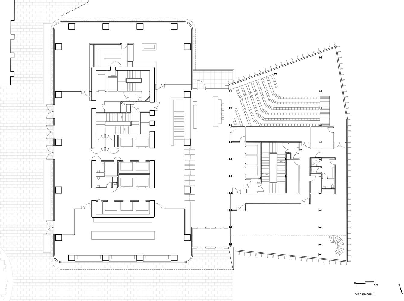 《变形记》——亭子是一件珍贵的玻璃制品,白天反光,晚上透明。它被垂直的磨砂玻璃板条环绕,充当着为建筑和用户服务的微妙过滤器。这种有机皮肤全天捕捉不断变化的光线,放大或漫射其光芒。它在一个以办公楼为主的地区创造了一种罕见的建筑亲密感,提供了对周围社区的可控、谨慎的看法。板条的节奏充分展现了建筑几何形状创造角度的潜力。然而,展馆并不符合严格的直角。它的每个角落都有自己的意义:弓形、后退式、最长立面的凯撒式——通过建筑创造的三个城市楼层(楼板)得到了加强。这是真正意义上的活建筑,在形式和功能上都是有机的。公众可以在展馆内和周围自由活动,从圆形楼层到屋顶,从虹膜广场到Reflets广场,或者进入极光塔的接待区。一条内部街道被设计为Place des Reflets的延伸,将塔楼和展馆连接起来,增强了运动的流动性。这些融入项目的新路径与该地区的原始设计形成鲜明对比,该设计将圆形平面与步行前院围起来。