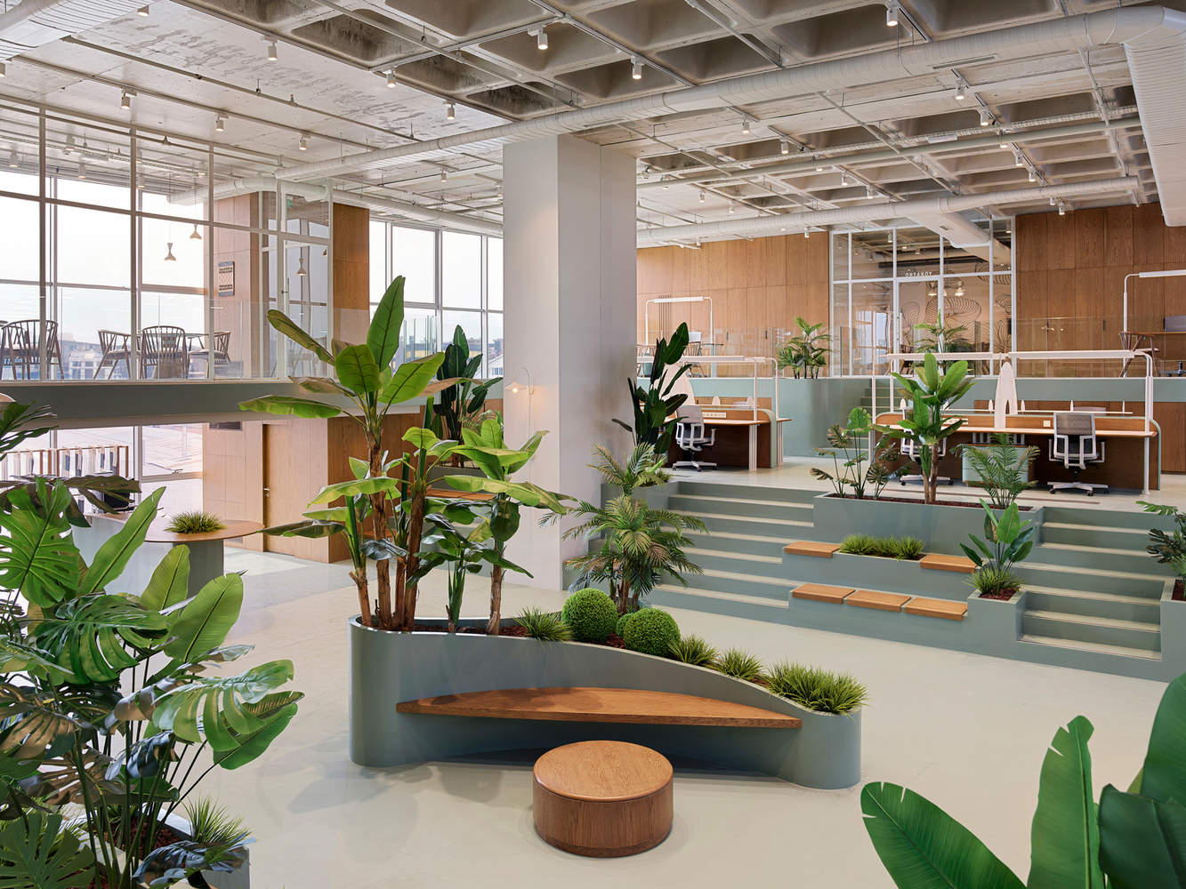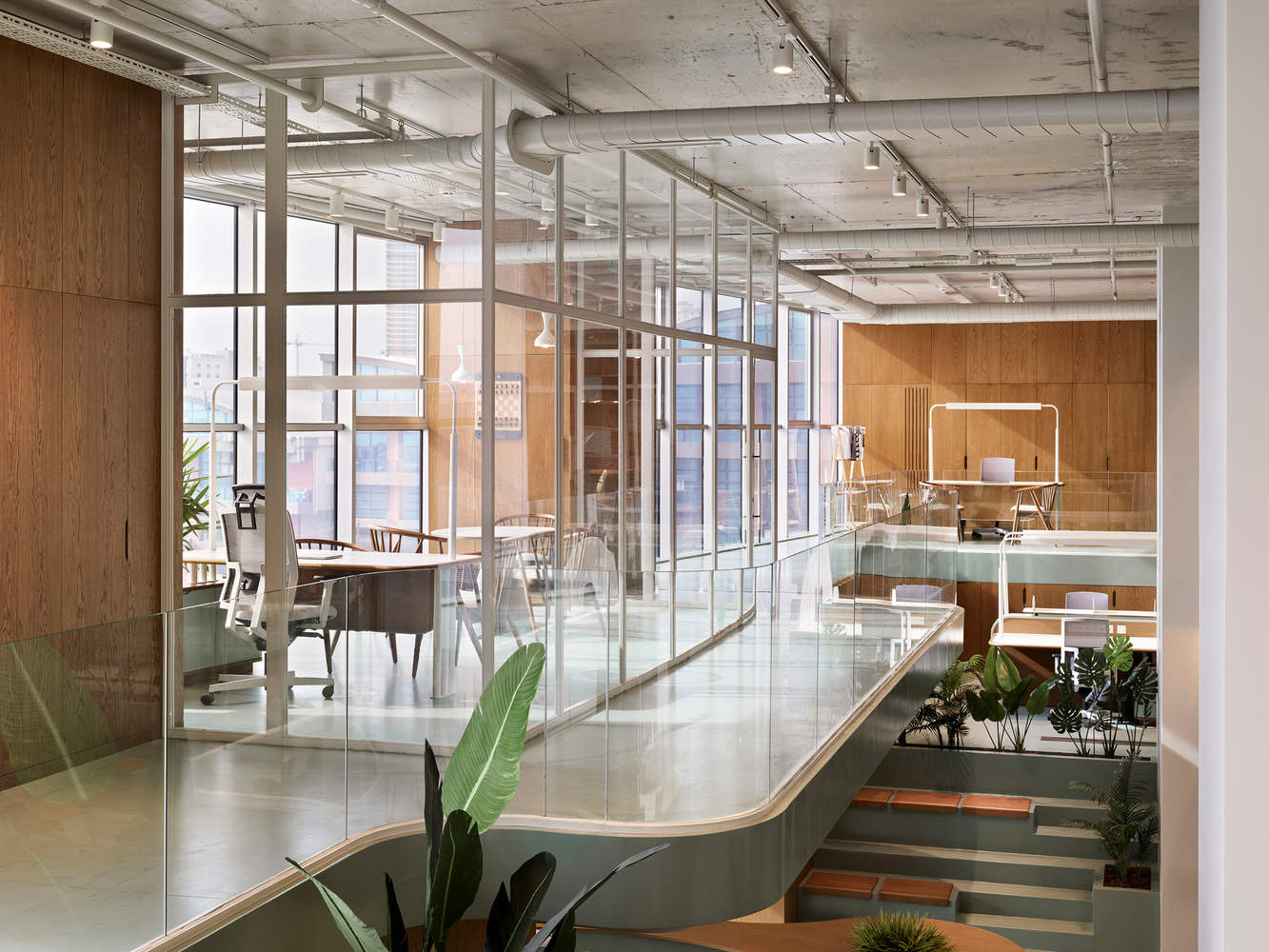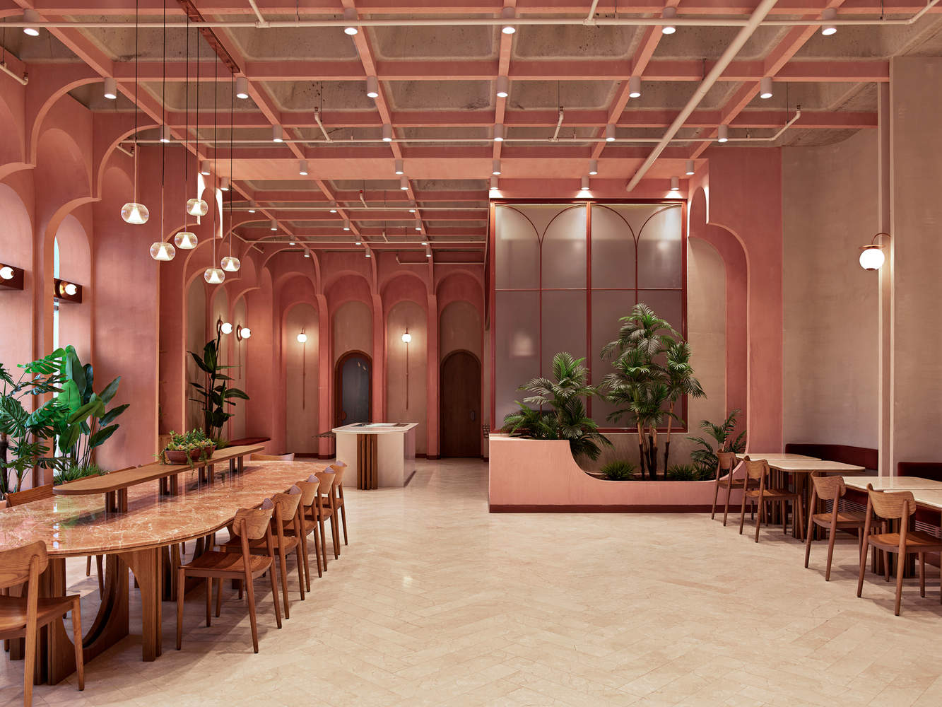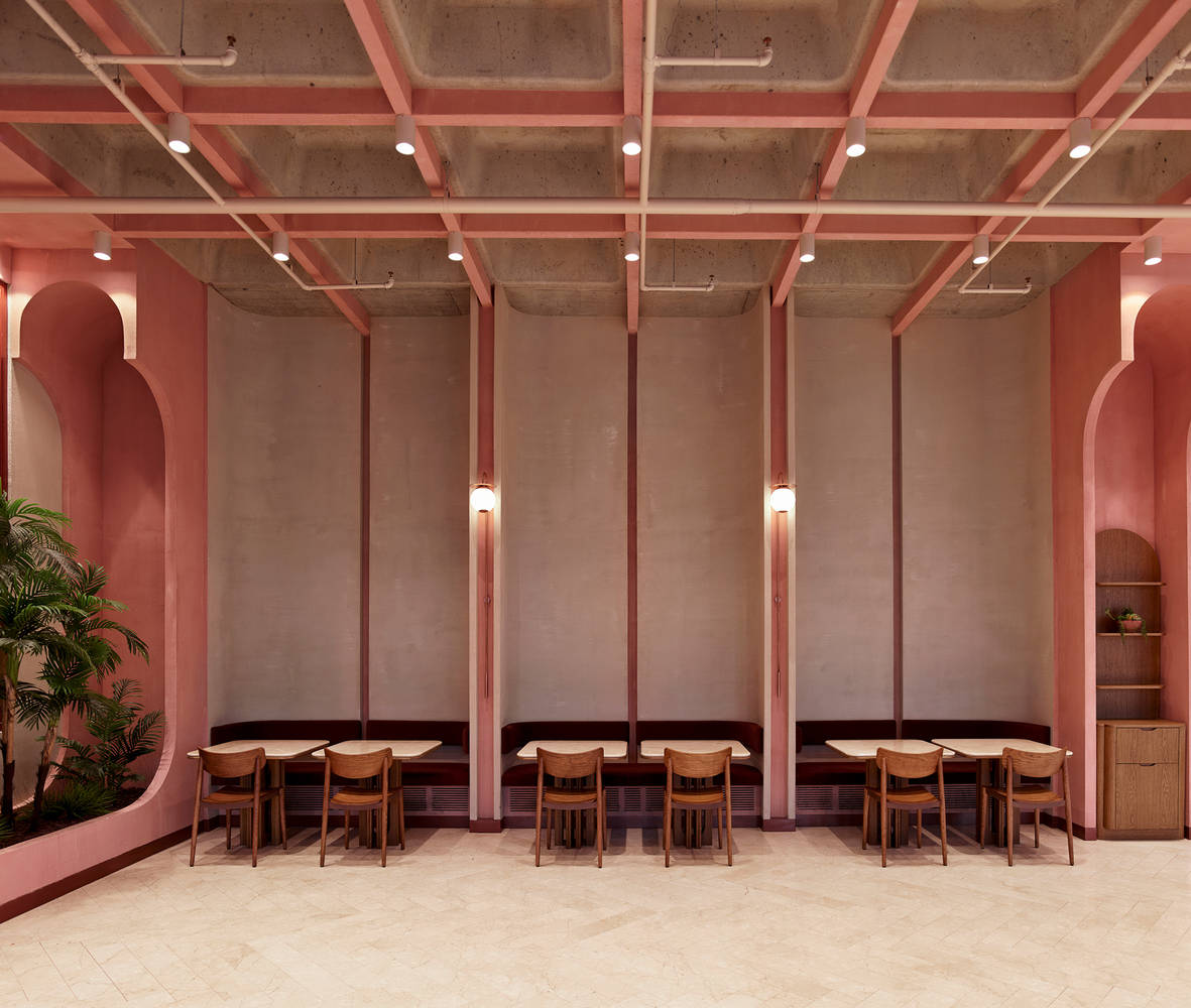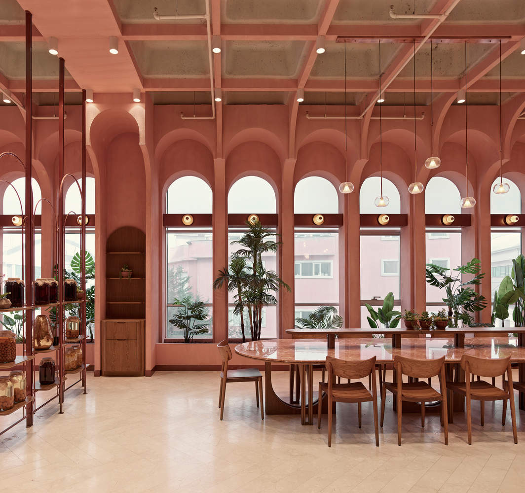 用餐区的诗意营造:用餐区的设计与工业化的生产空间形成鲜明对比,强调了“阈值”的概念,通过显著的空间感知变化为员工提供了一个温馨、舒适的休息场所。设计师巧妙地利用盒式天花板结构和网格系统,创造出一个透气且富有诗意的环境。反复出现的拱形壁龛和暖色调材料的运用,不仅软化了工业风格的原始感,还为员工提供了一个与工作区截然不同的放松氛围,体现了对人性化的深度关注。